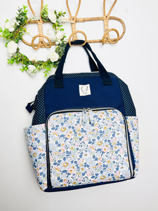 Le sac à dos enfant personnalisé Églantine Liberty of London mitsi outremer et bleu nuit doré