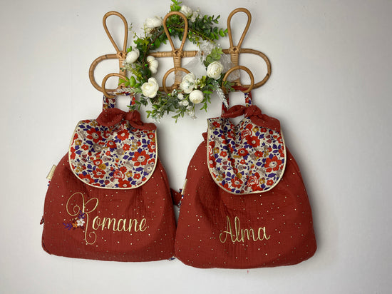 Le sac à dos enfant personnalisé Églantine Liberty théo gold et double gaze tomette doré