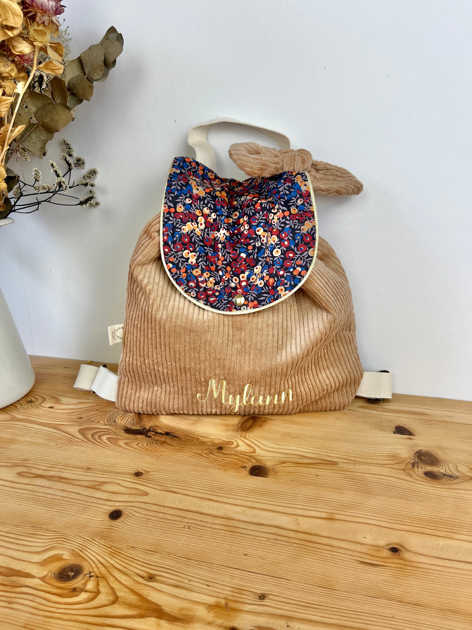 Le sac à dos Églantine velours camel et Liberty wiltshire burnt Personnalisable