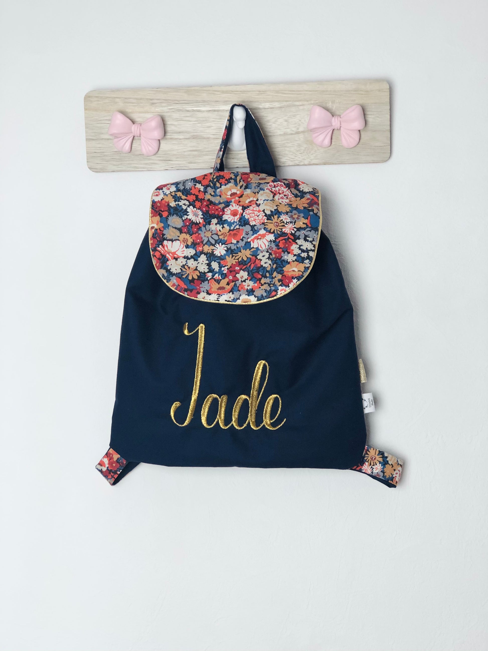Le sac à dos enfant personnalisé Églantine gabardine bleu nuit et Liberty thorpe Personnalisable