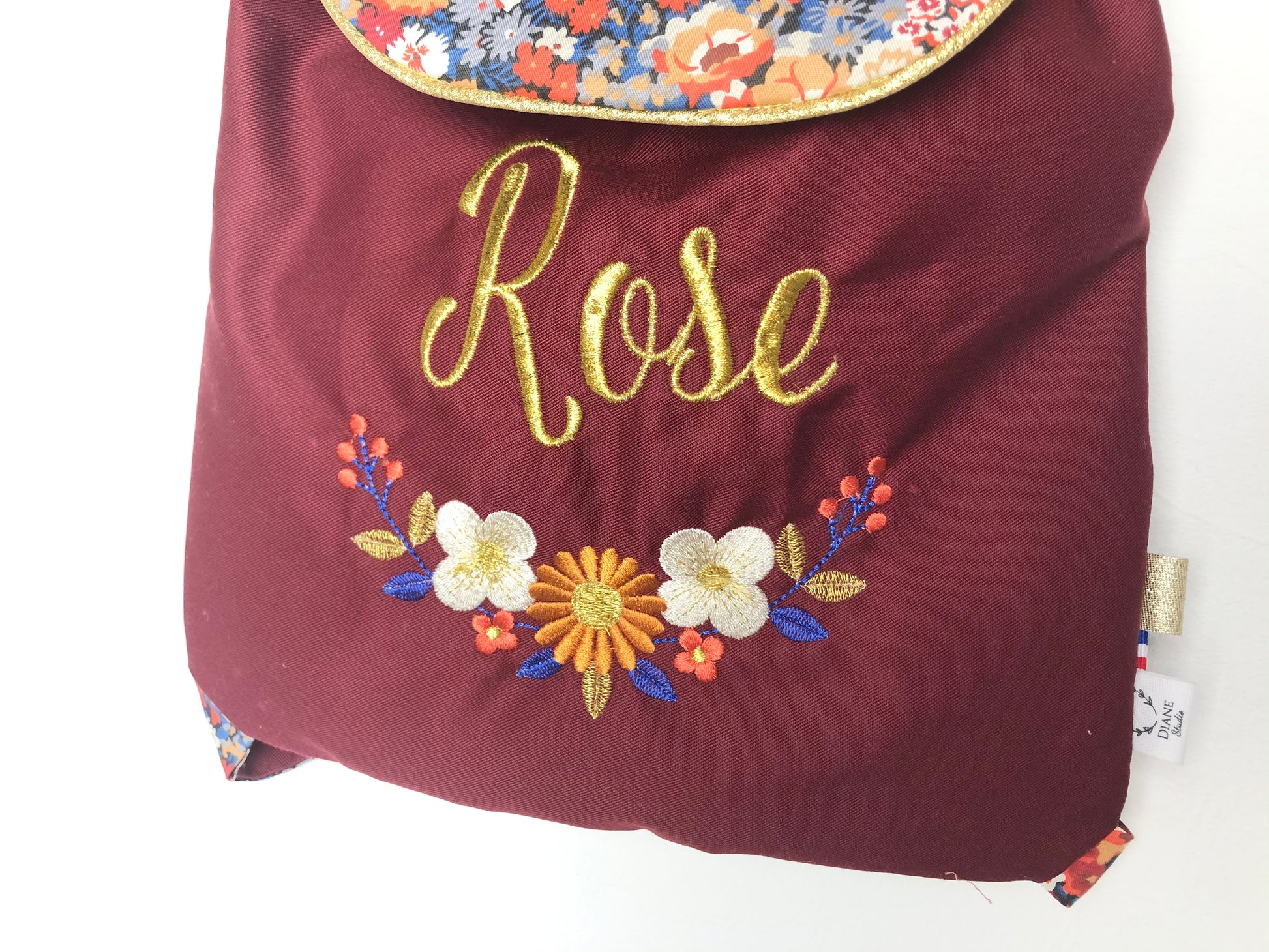 Le sac à dos enfant personnalisé Églantine gabardine bordeaux et liberty thorpe Personnalisable