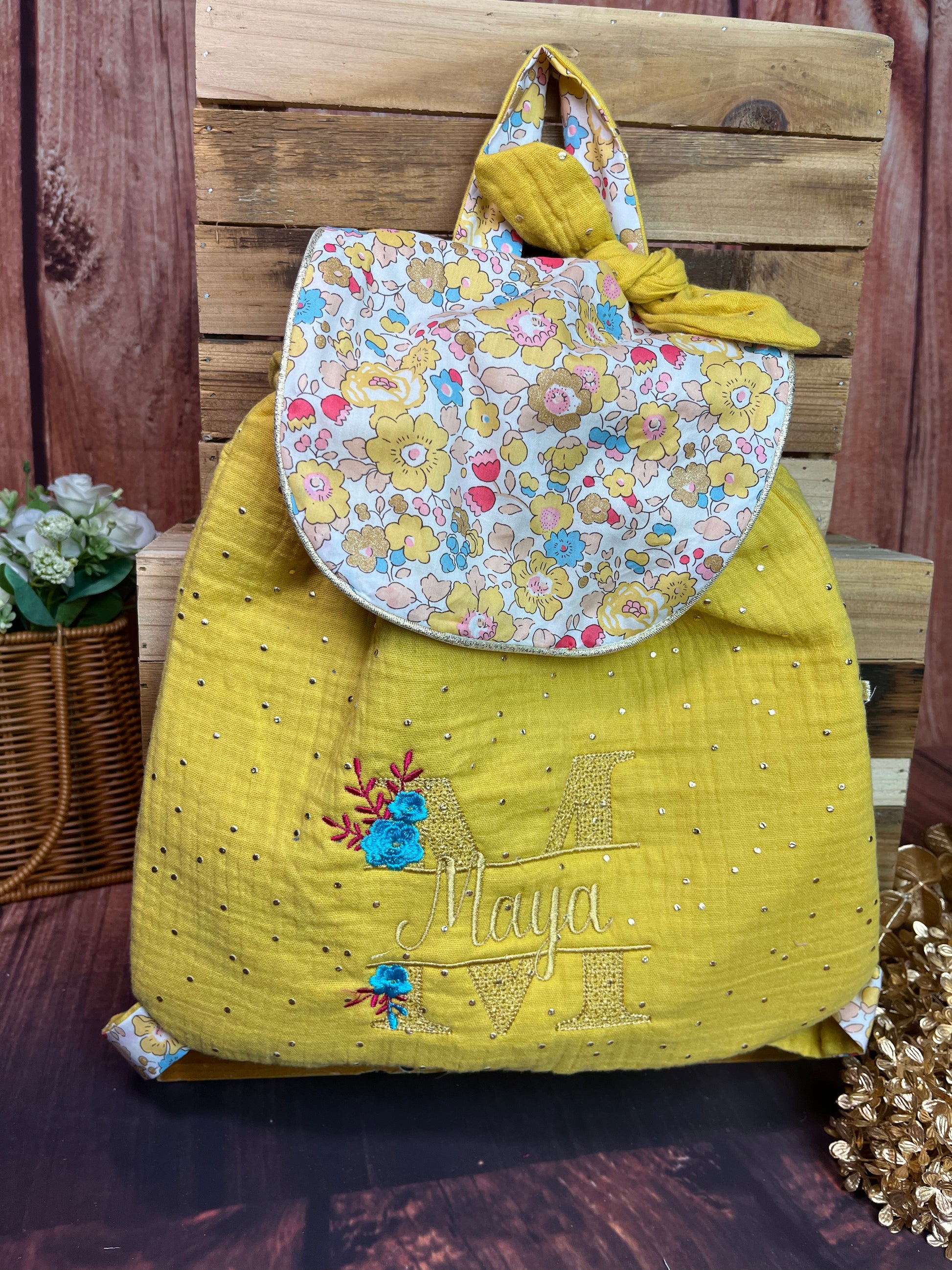 Le sac à dos enfant personnalisé Églantine Liberty exclusif doré gaze moutarde Personnalisable