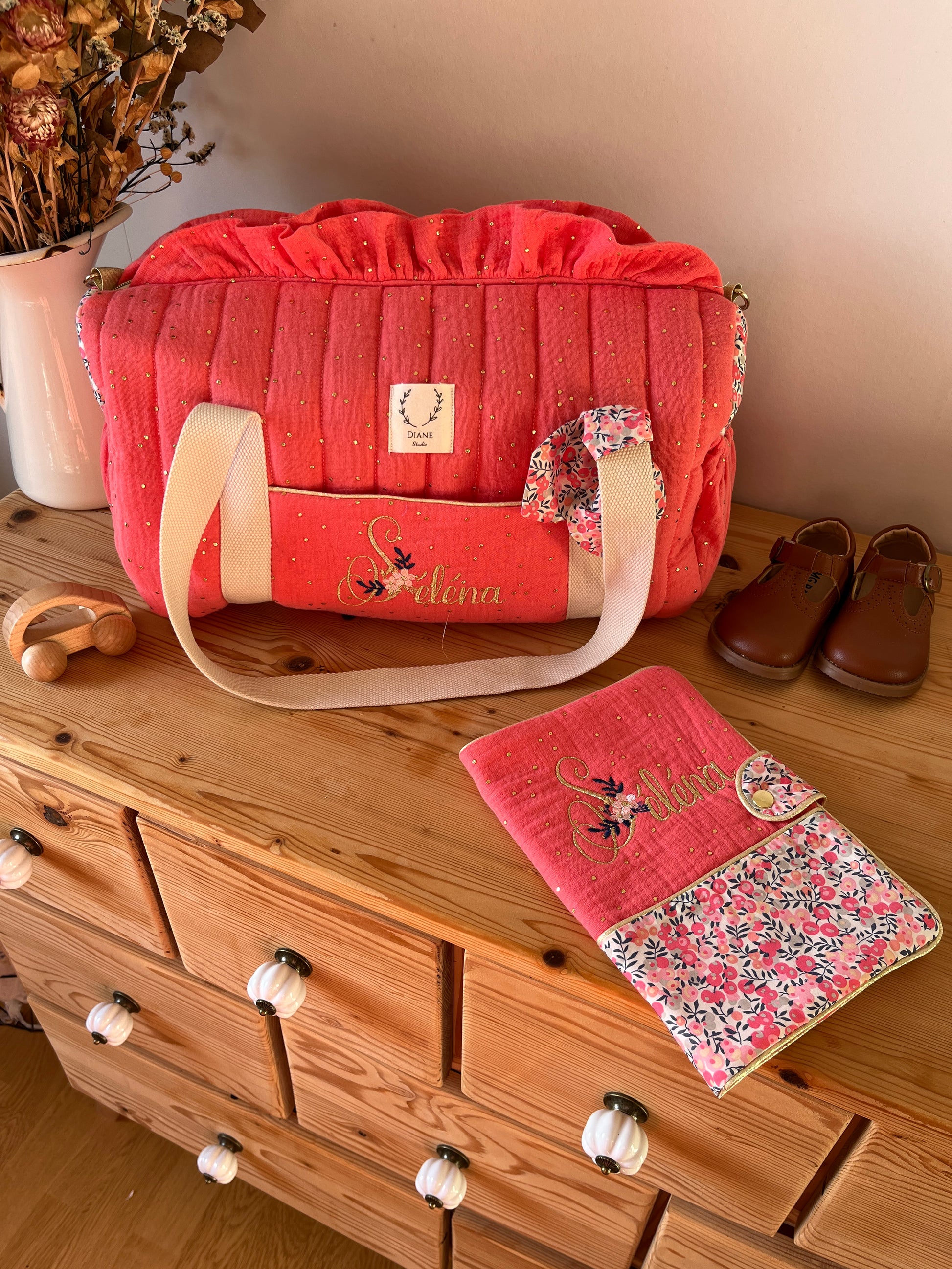 Ensemble : sac polochon et protège carnet Liberty senteur et gaze Corail initiale florale Personnalisable