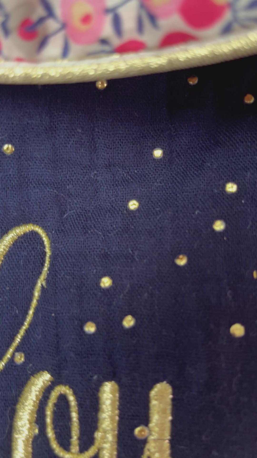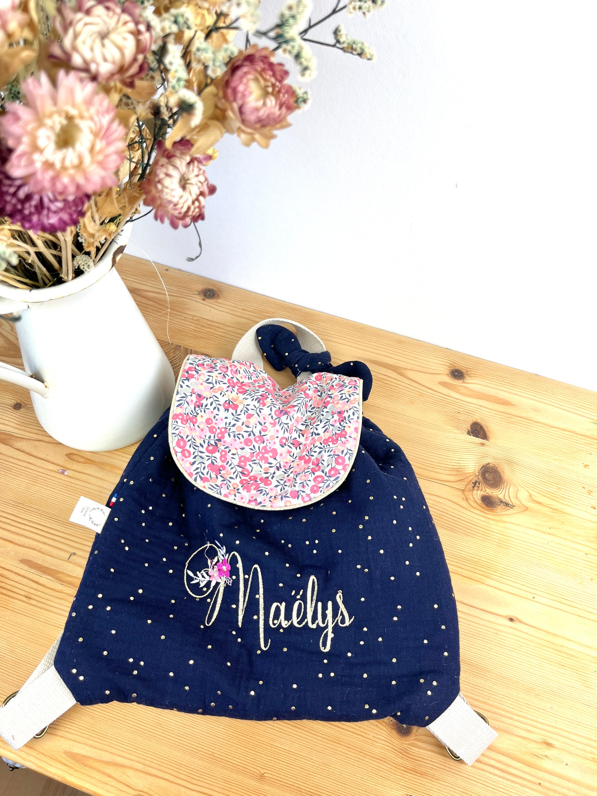 Le sac à dos enfant personnalisé Églantine Liberty wiltshire et double gaze bleu nuit doré Personnalisable