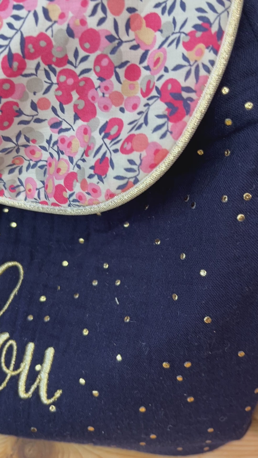 🌸 Matériaux de qualité : coton doux et résistant, avec passepoil doré autour du rabat (supprimable sur demande).