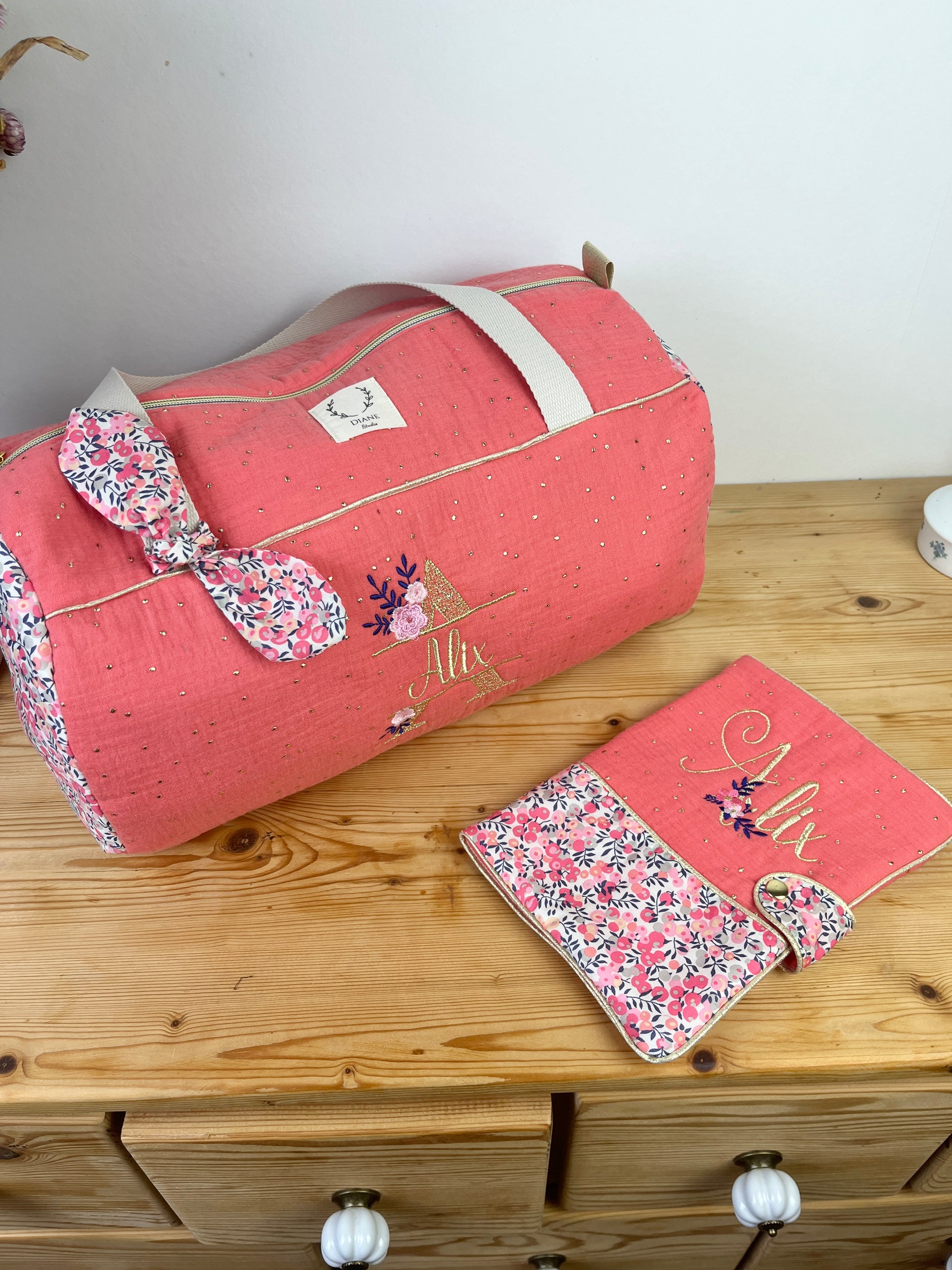 Cadeau de naissance : sac polochon et protège carnet Liberty pois de senteur Personnalisable