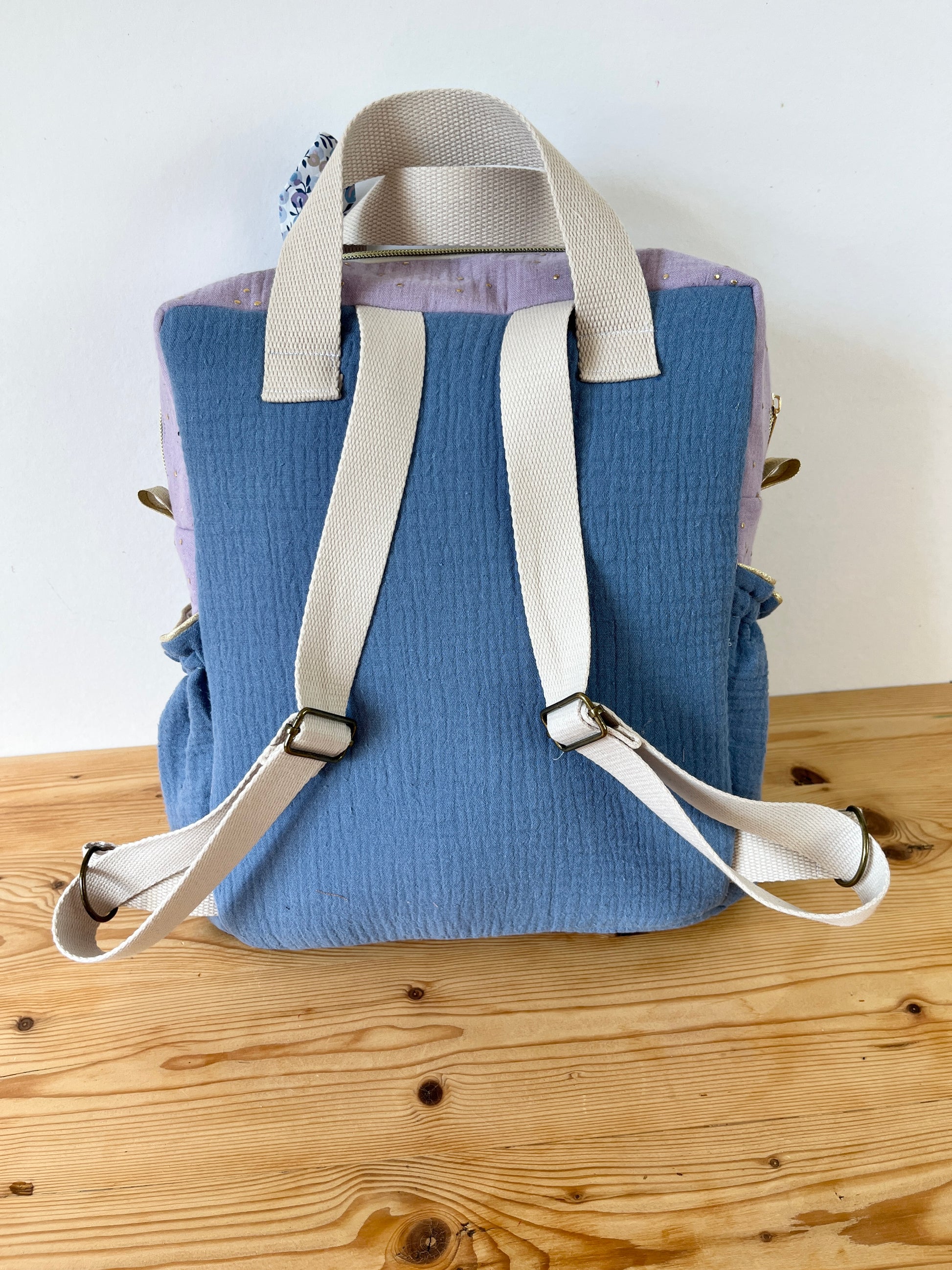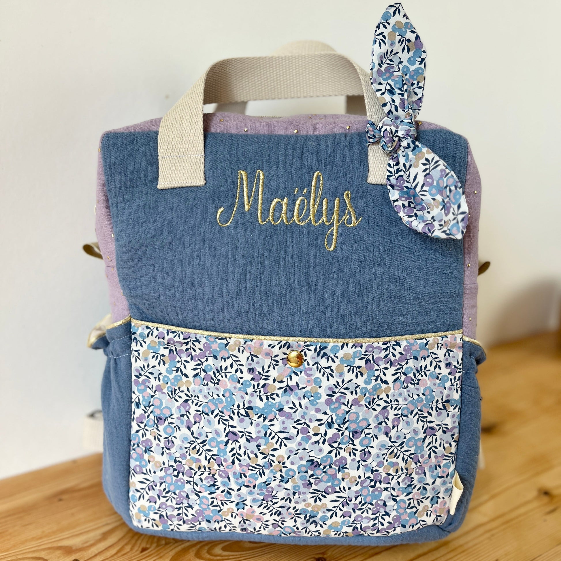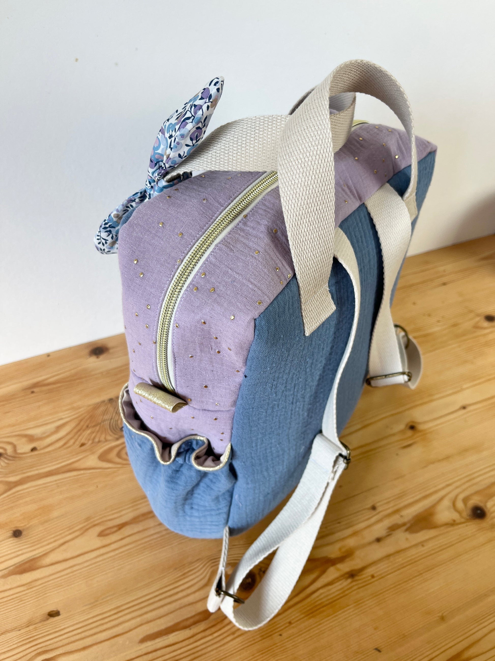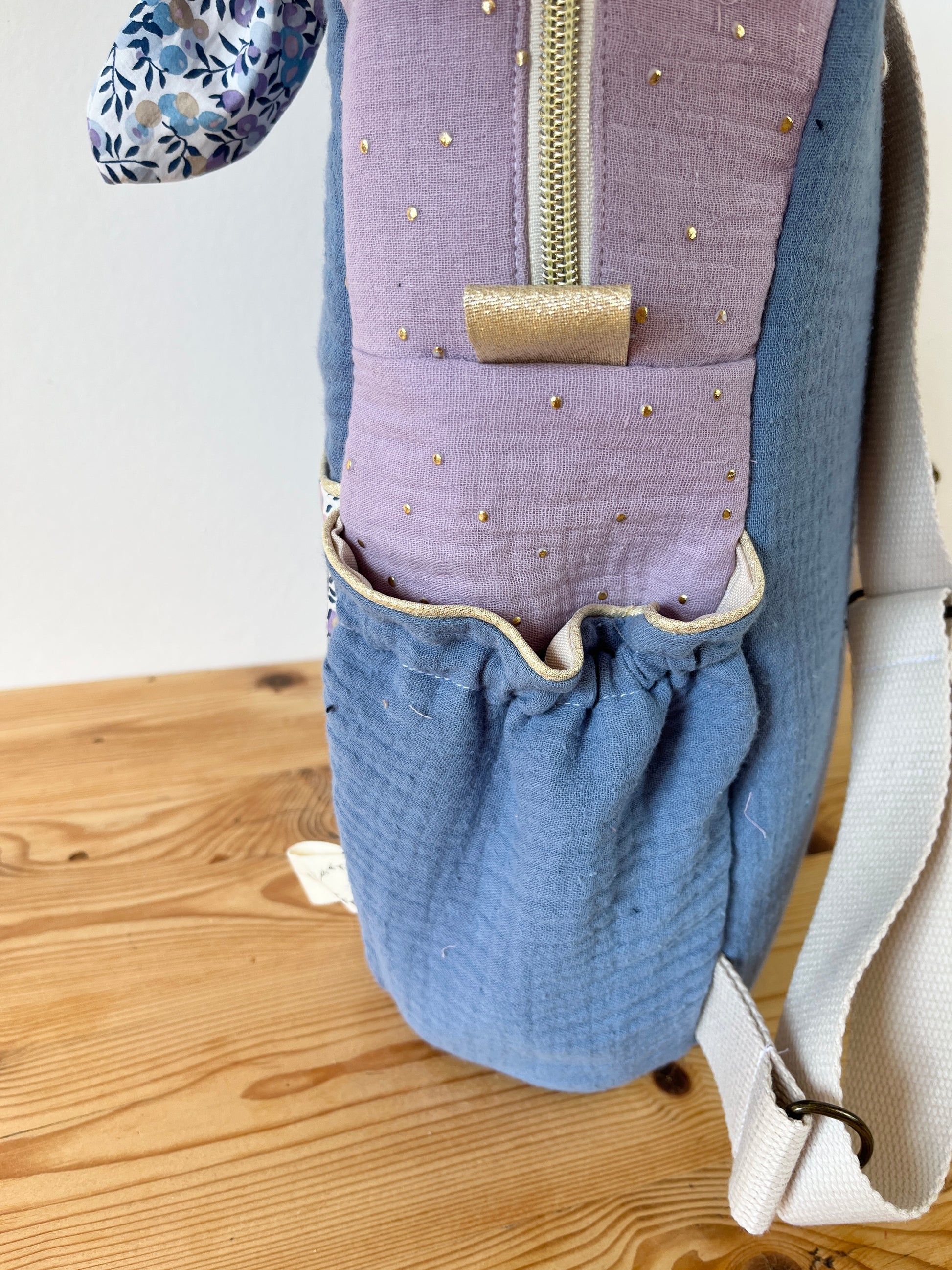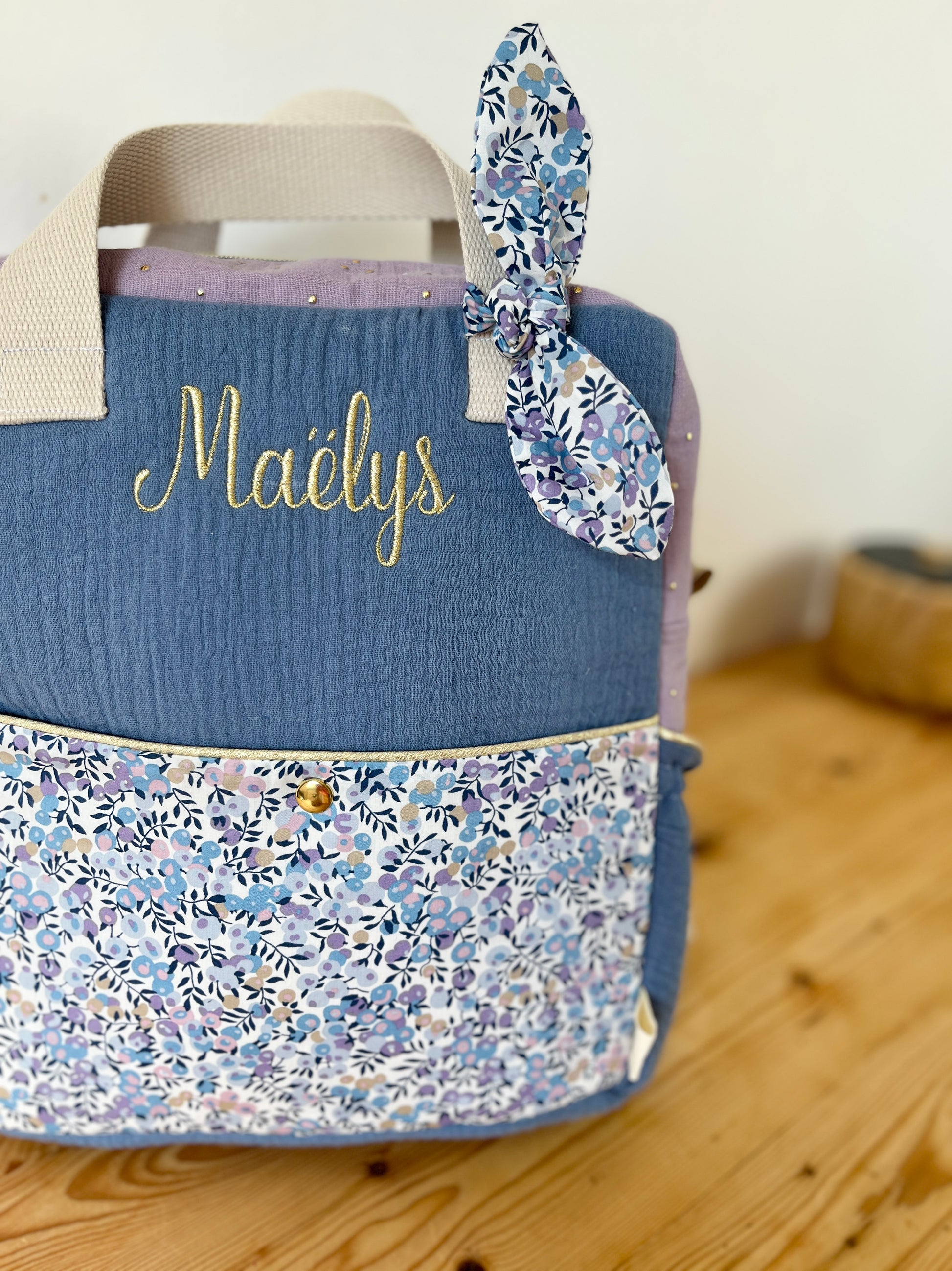 Le sac à dos enfant Ombeline double gaze indigot liberty wiltshire lilas Personnalisable