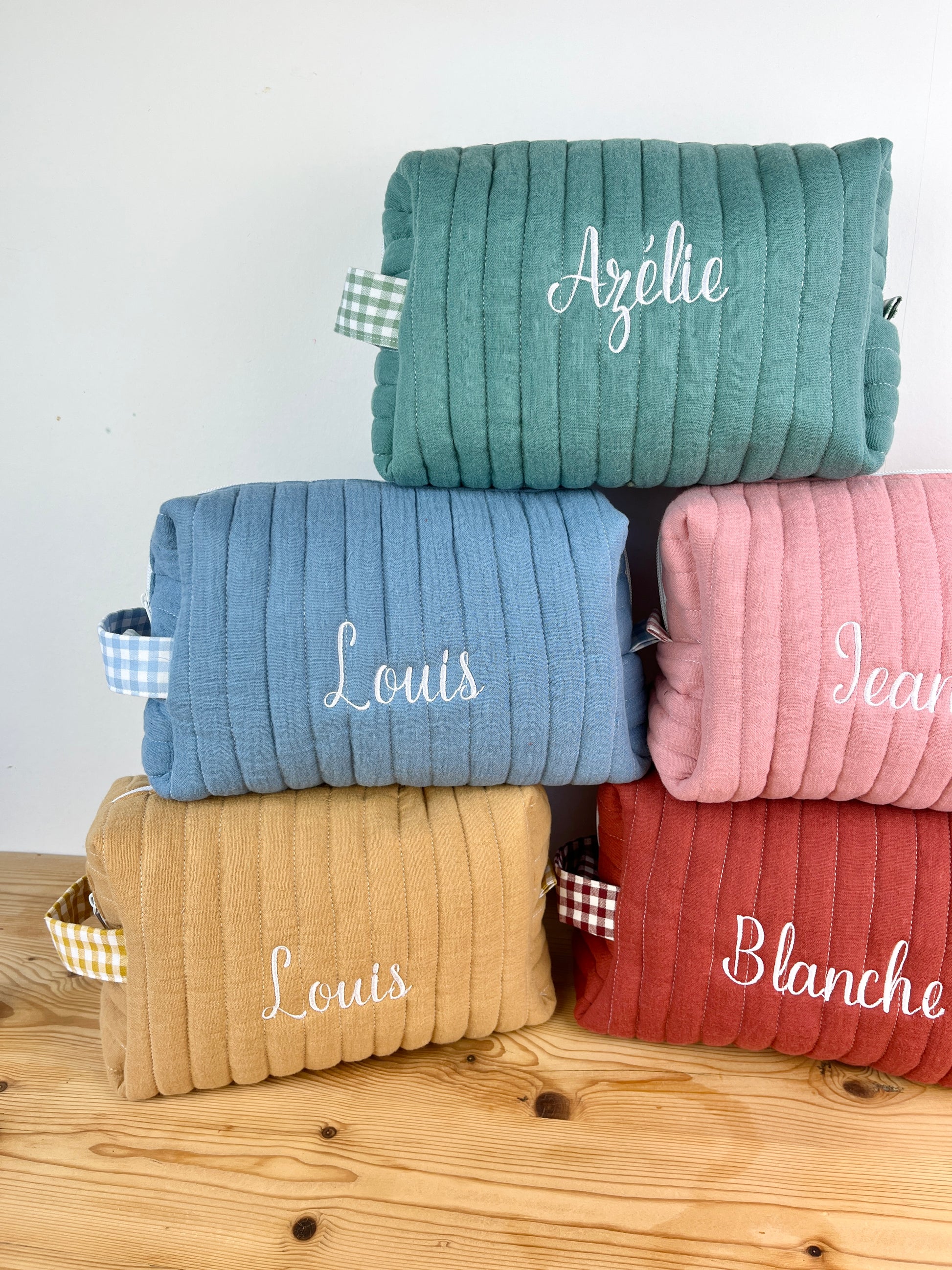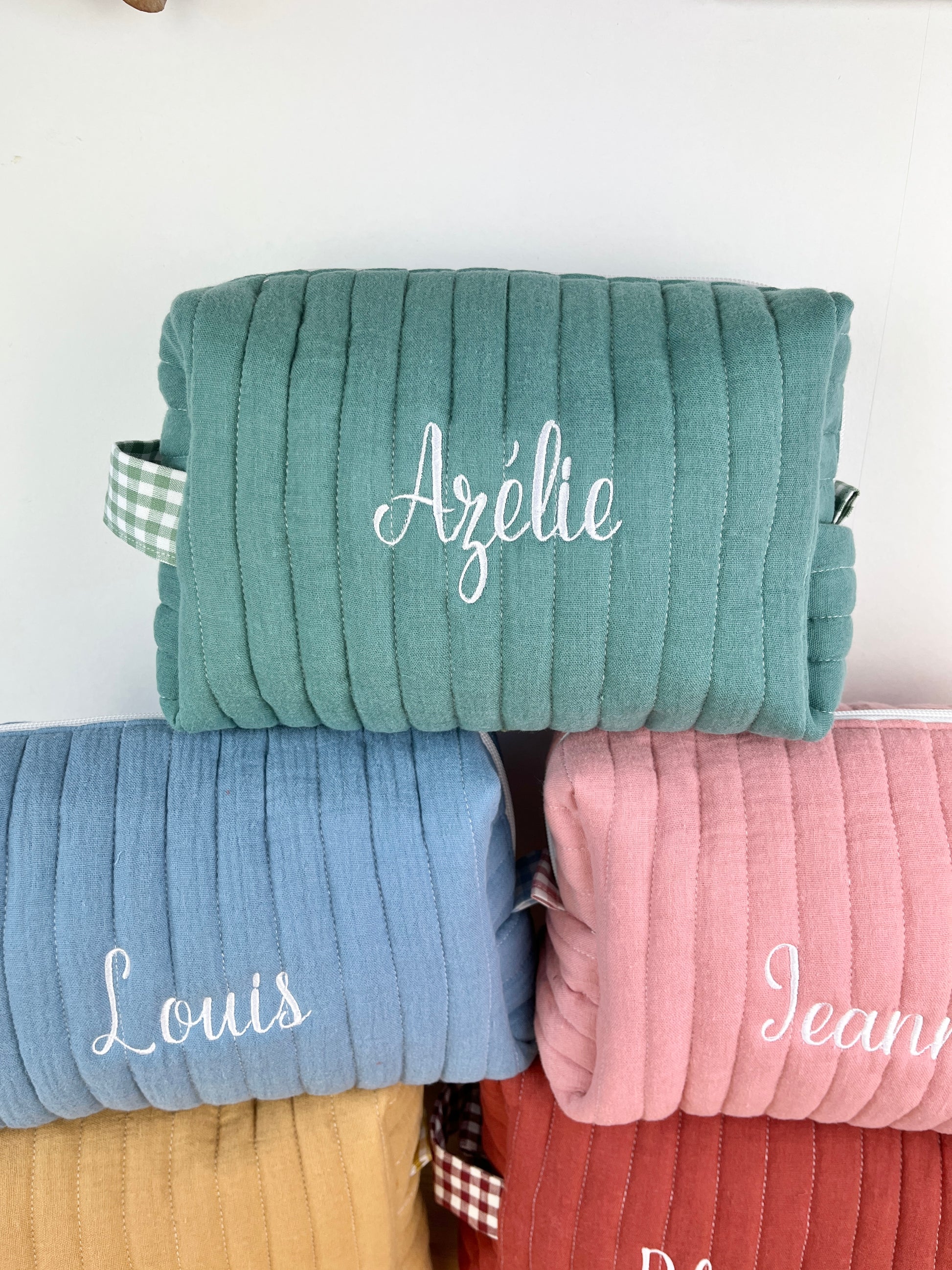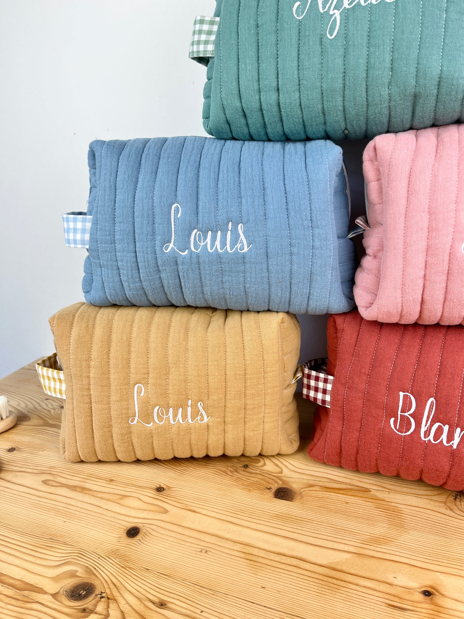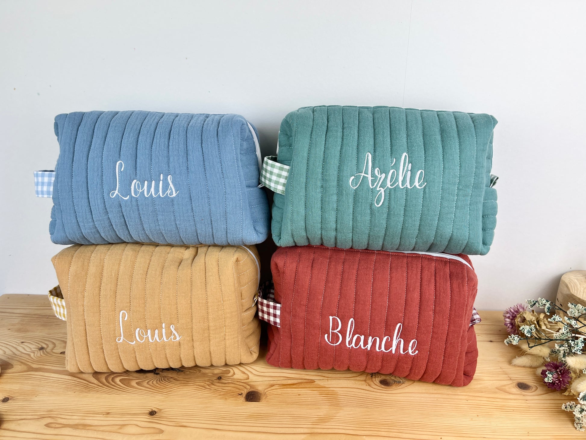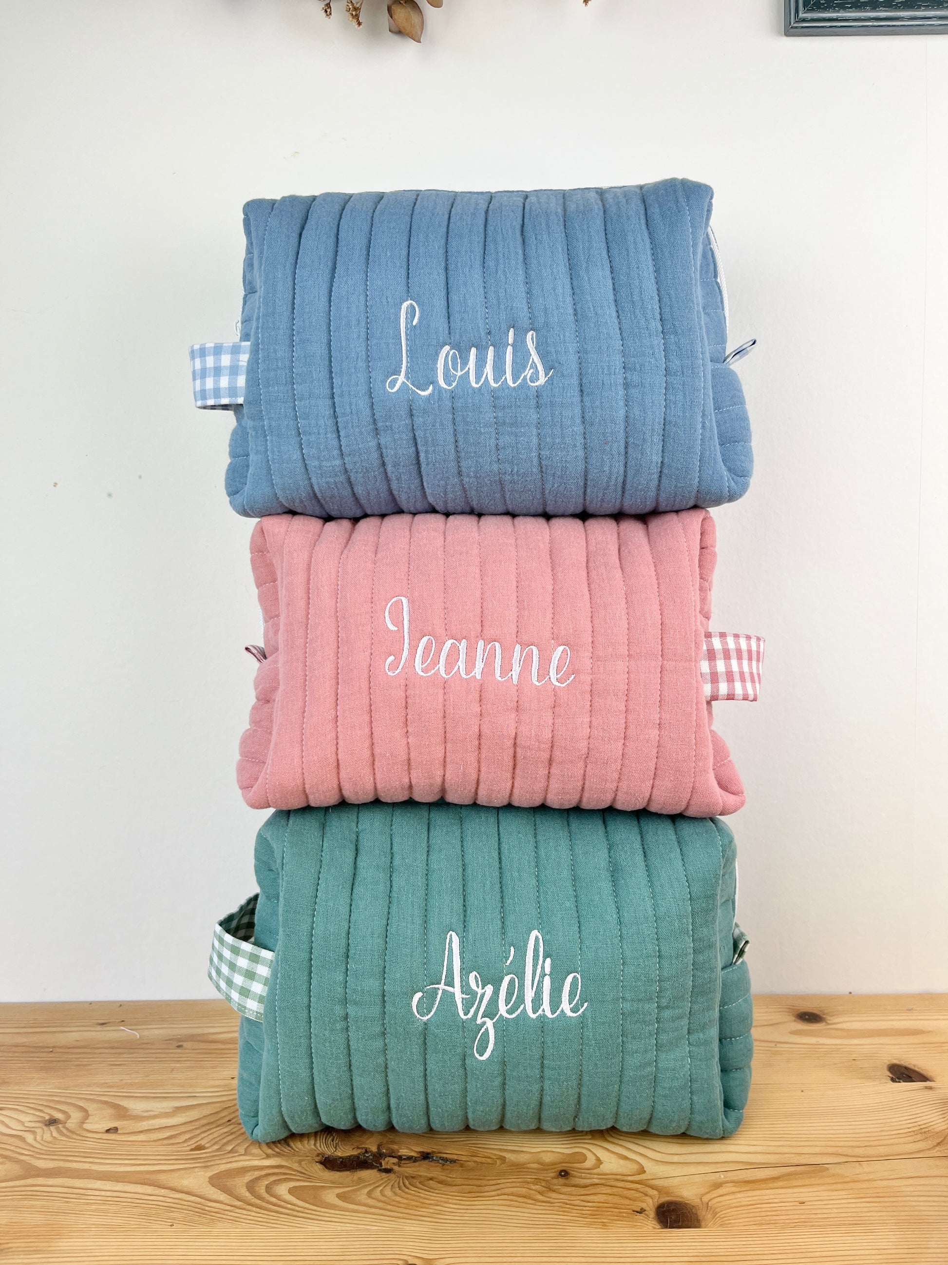 Ce coffret réunit le nombre de trousses de toilette de votre choix, avec les prénoms brodés. Vous pouvez mentionner avec le texte, les couleurs souhaitées.