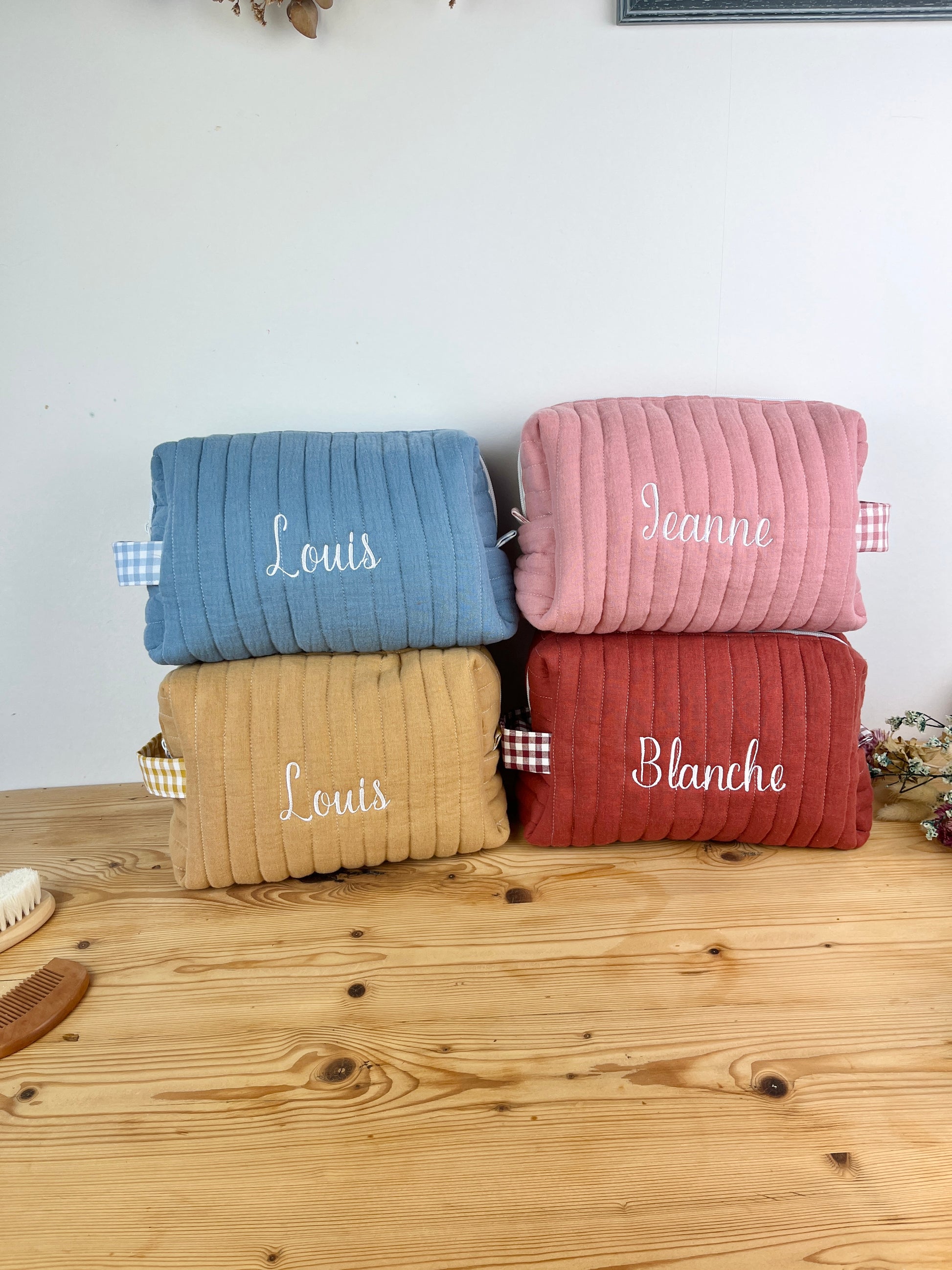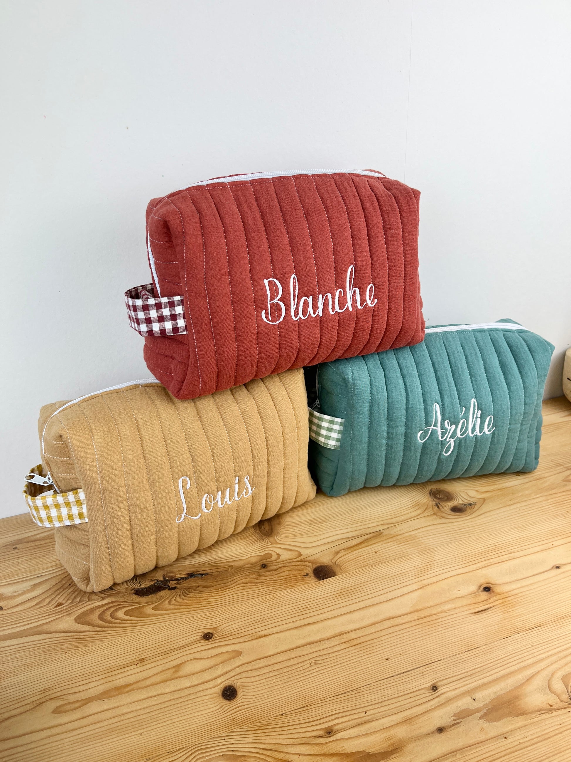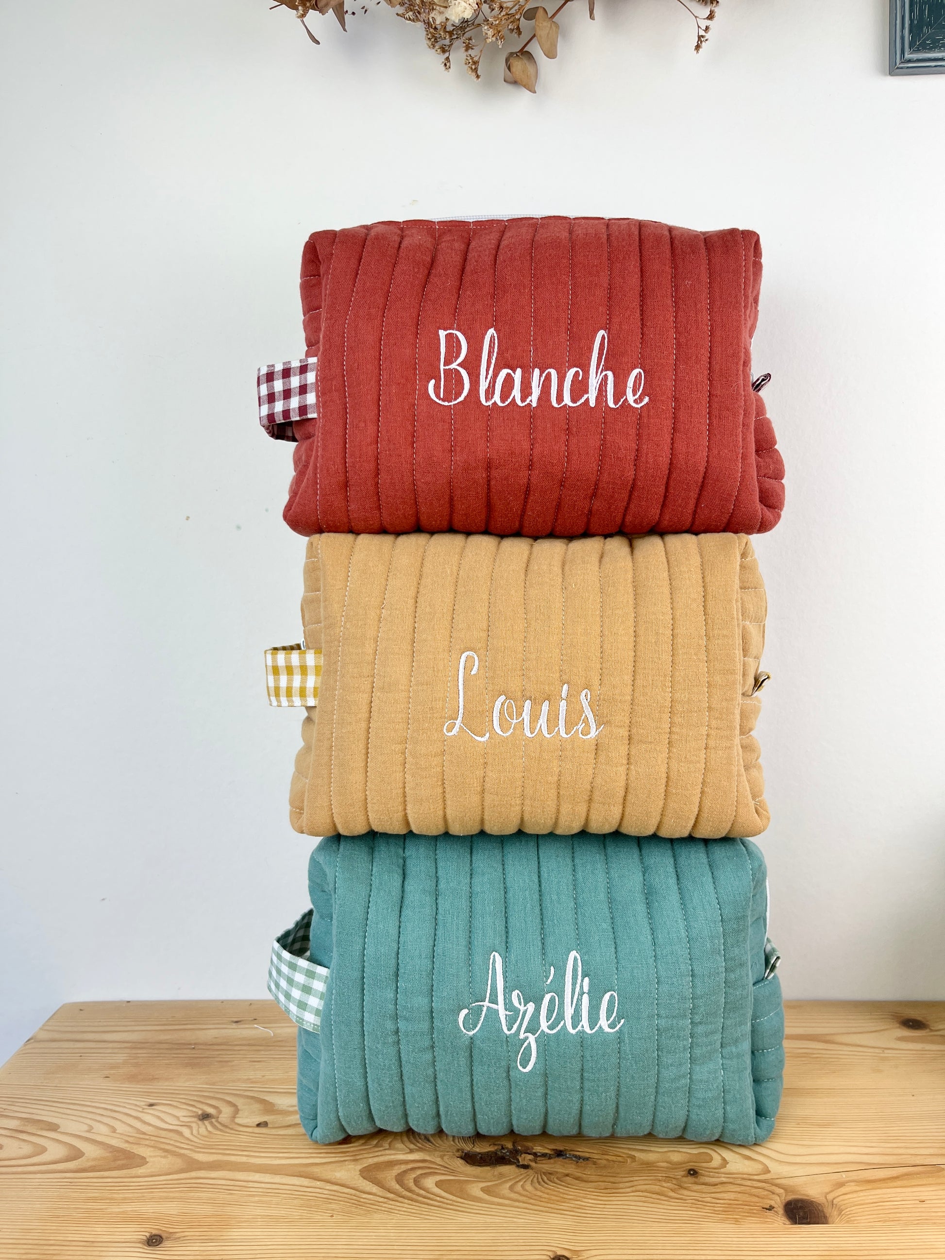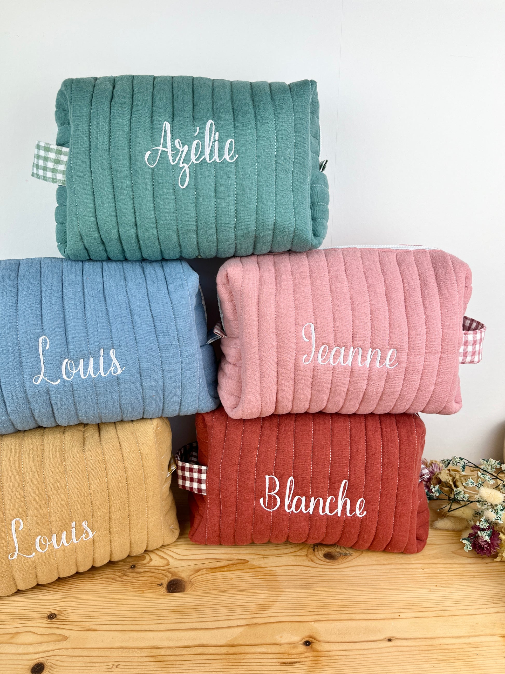 Ce coffret réunit le nombre de trousses de toilette de votre choix, avec les prénoms brodés. Vous pouvez mentionner avec le texte, les couleurs souhaitées.