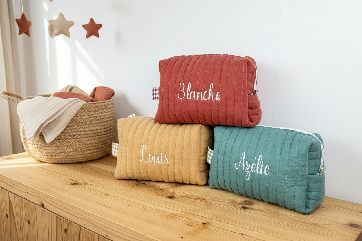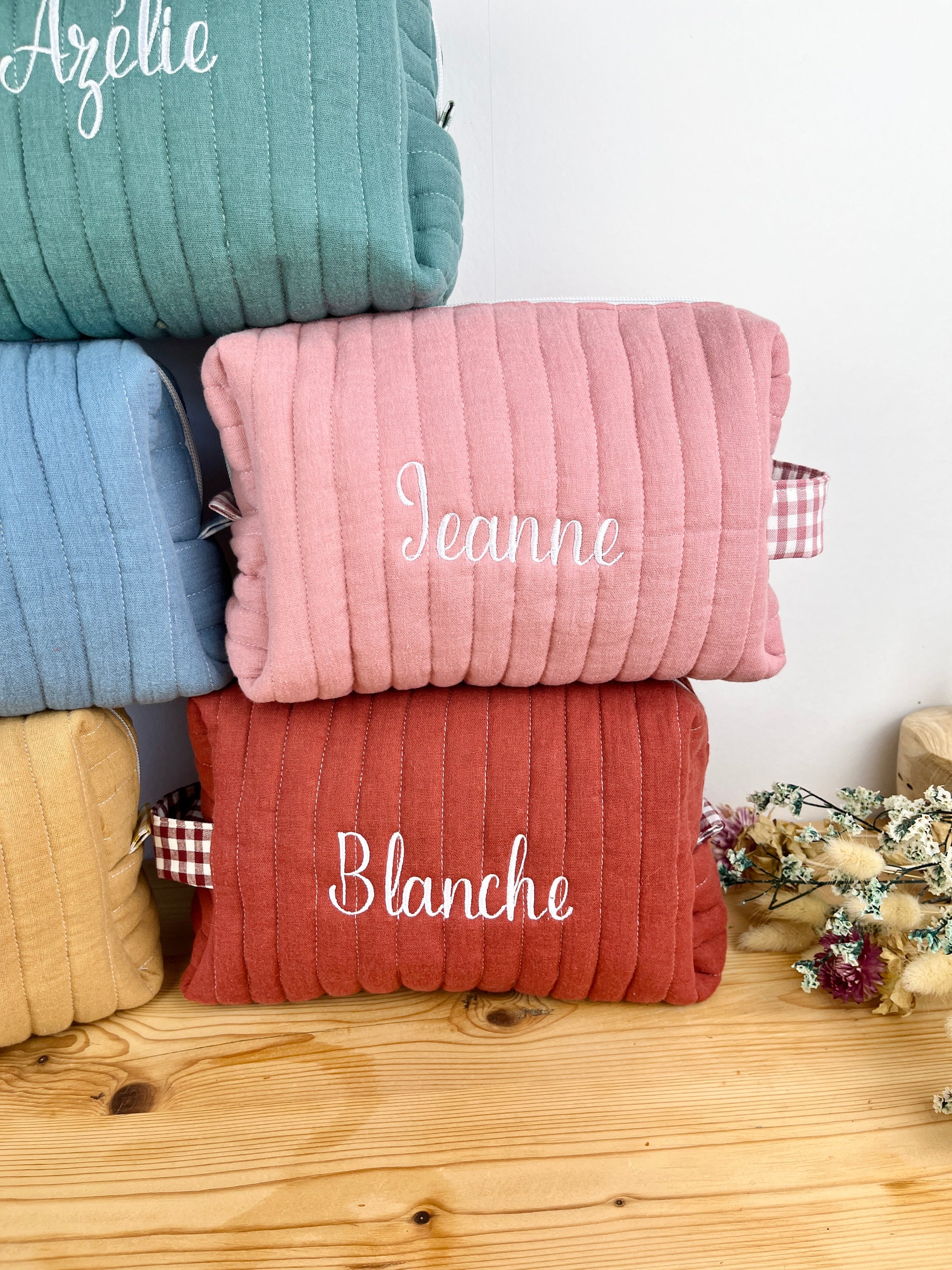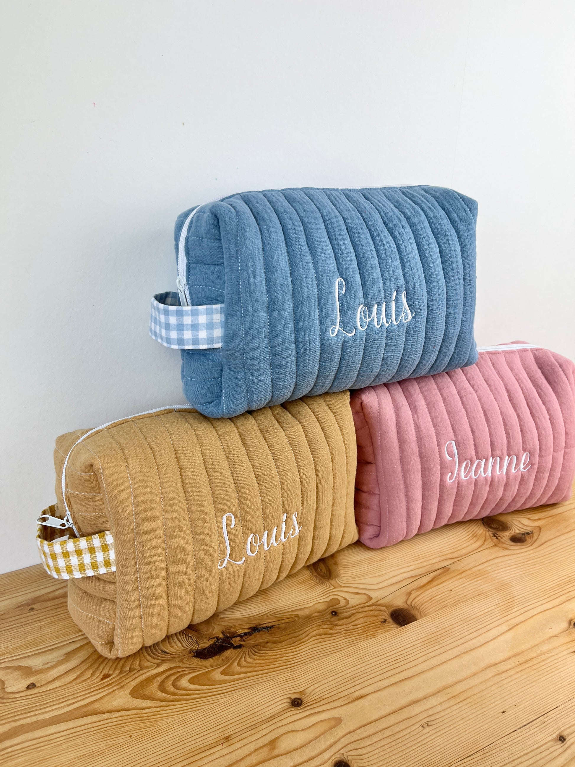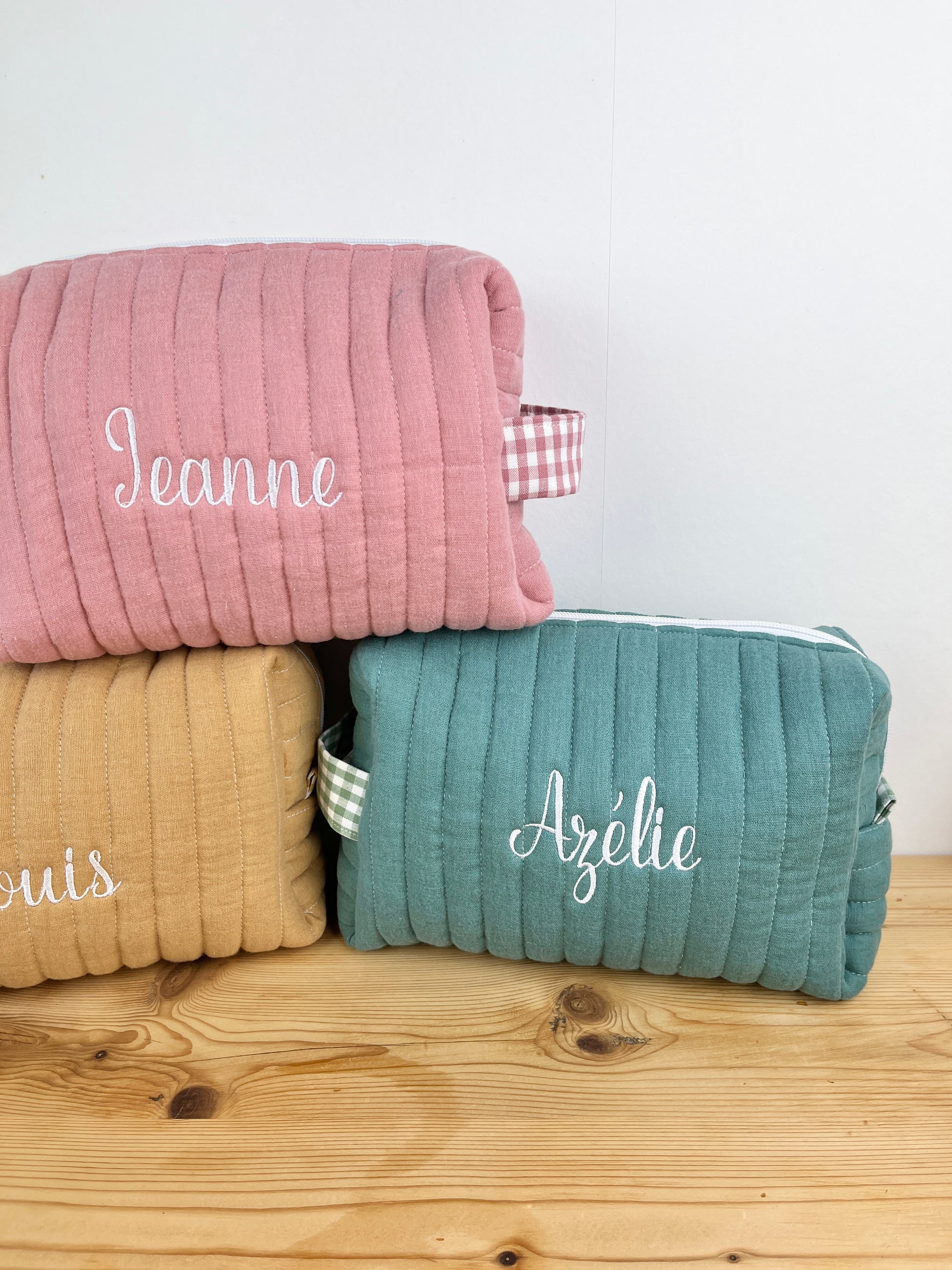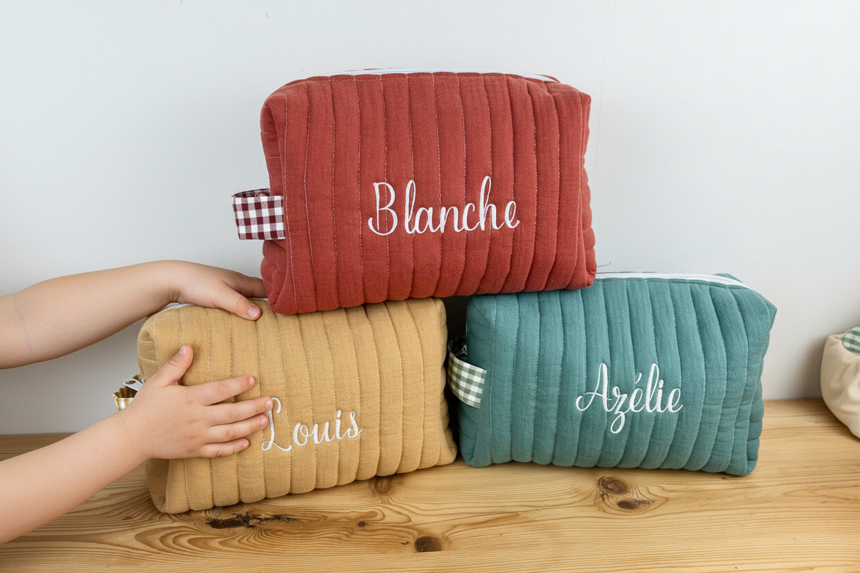 Ce coffret réunit le nombre de trousses de toilette de votre choix, avec les prénoms brodés. Vous pouvez mentionner avec le texte, les couleurs souhaitées.
