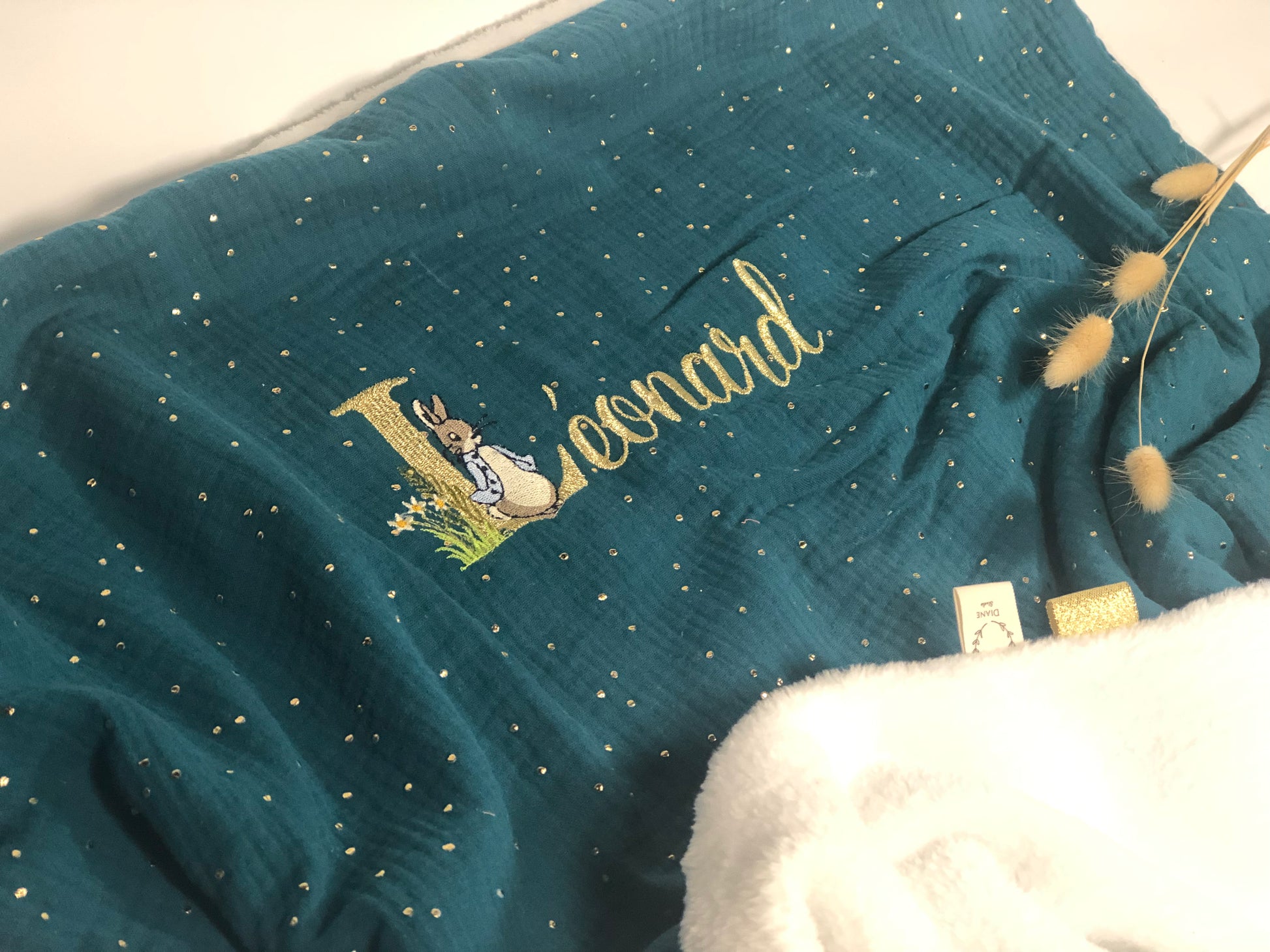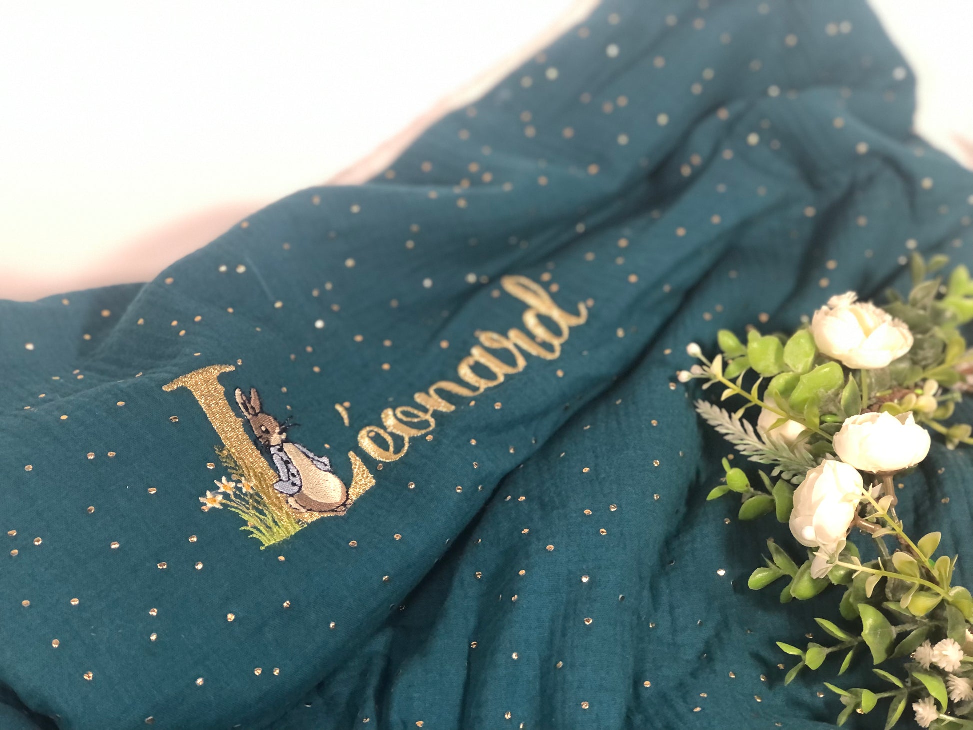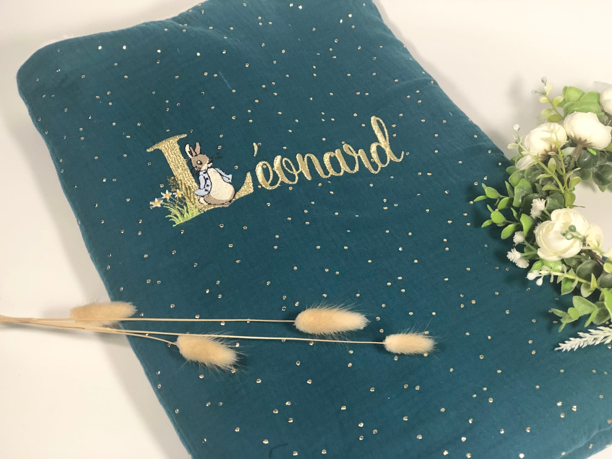 La couverture gaze vert paon et initiale Peter Rabbit Personnalisable