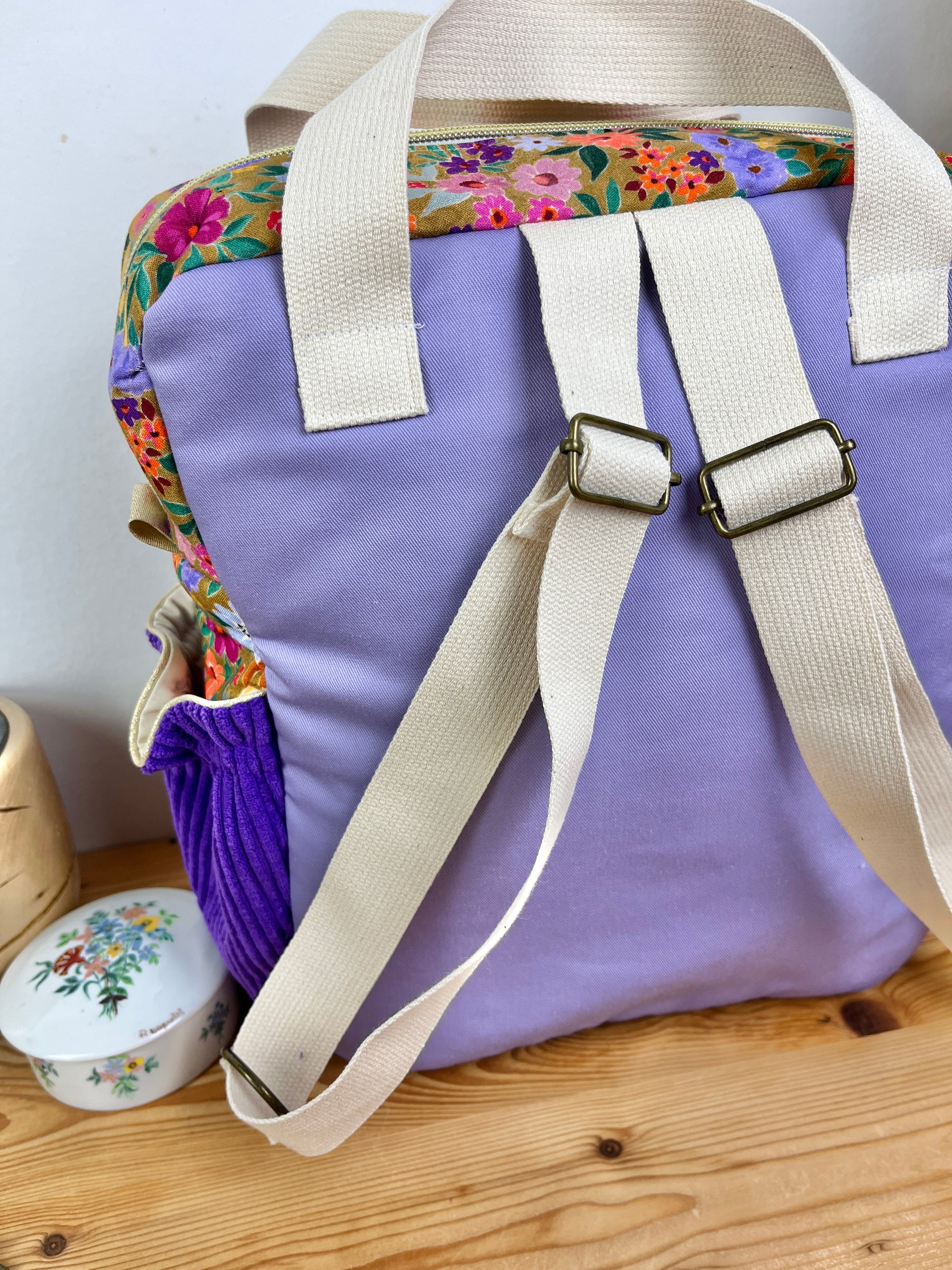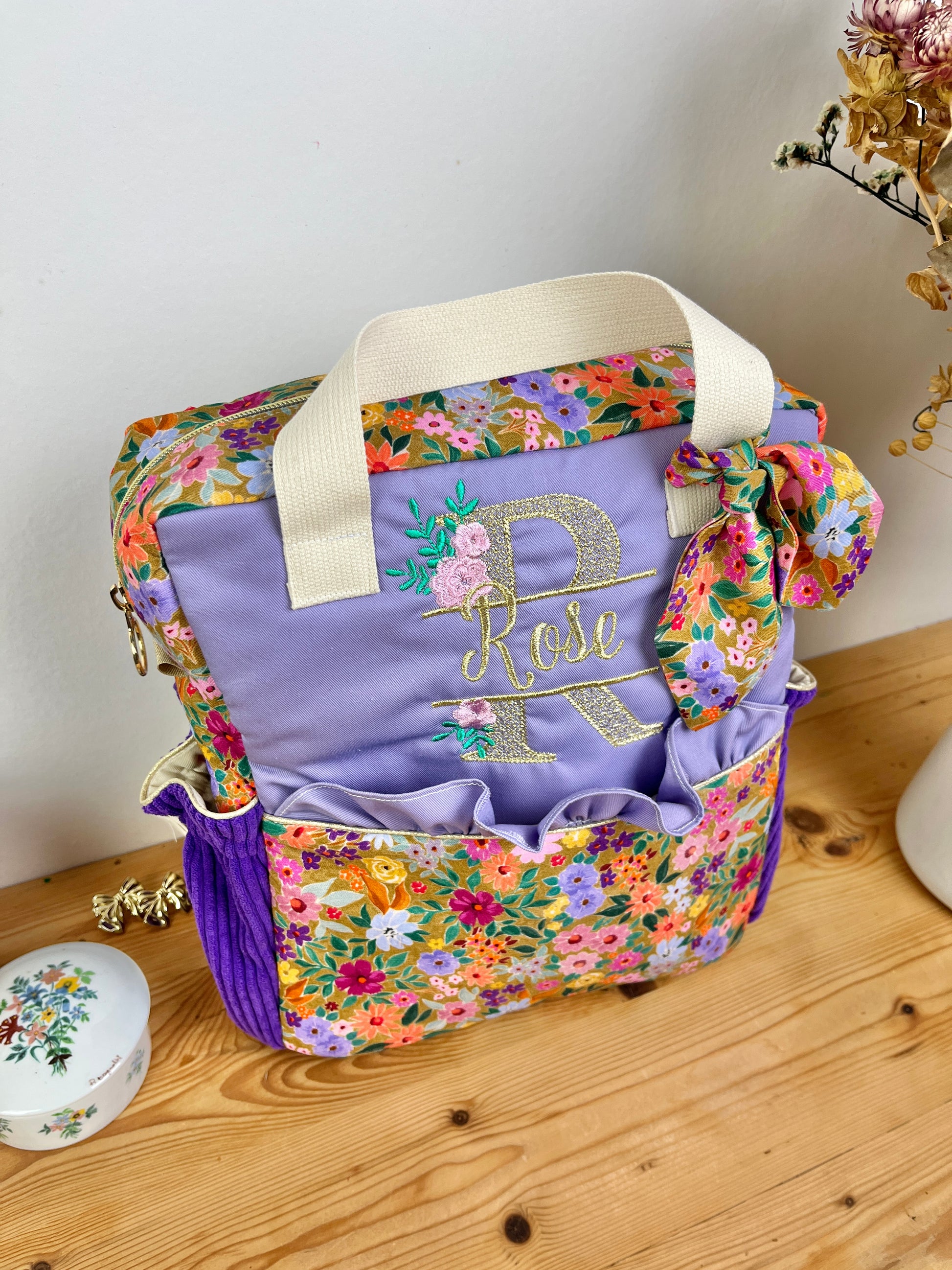 Le sac à dos enfant Ombeline gabardine lilas bloom mandarine velours violet Personnalisable