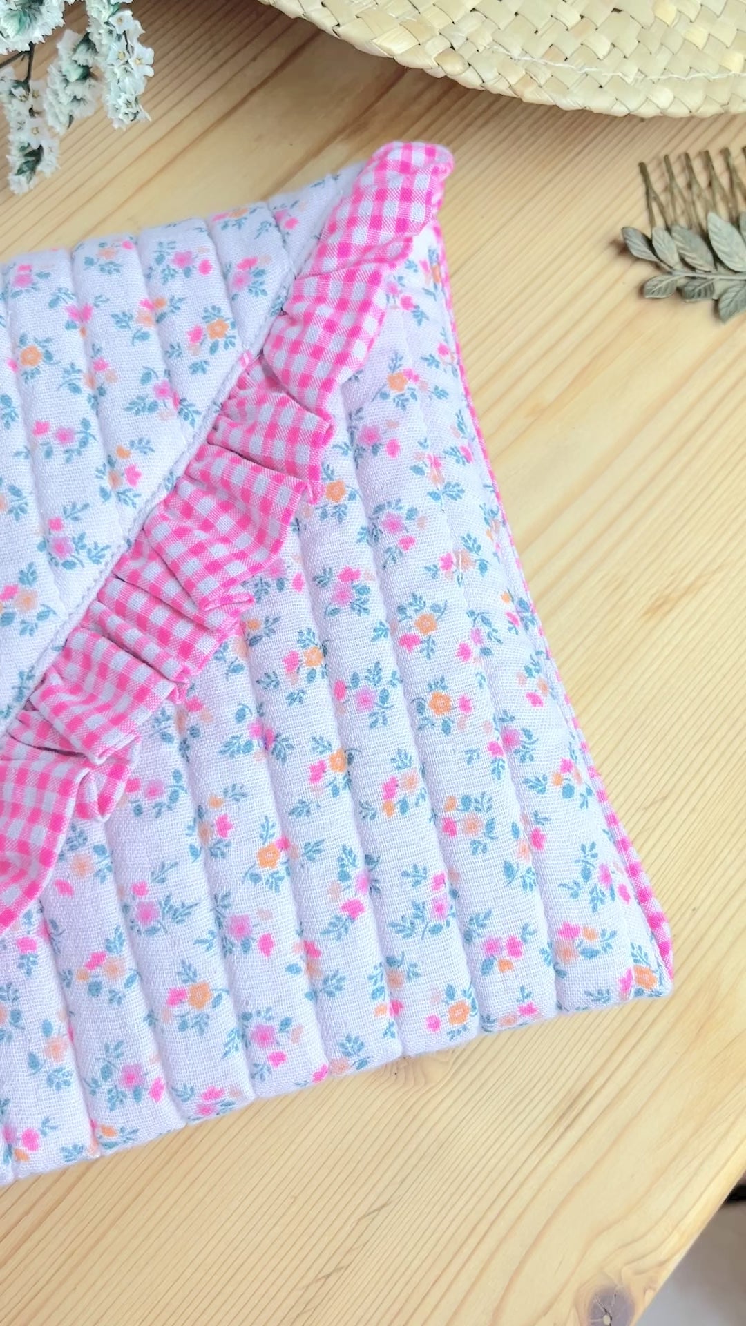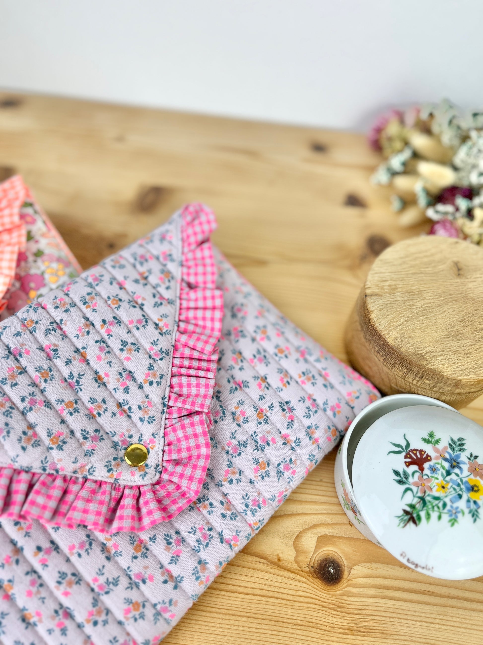 La pochette est constituée d’un magnifique coupon de Liberty of London et de vichy en coton. Elle est entièrement doublée et matelassée.