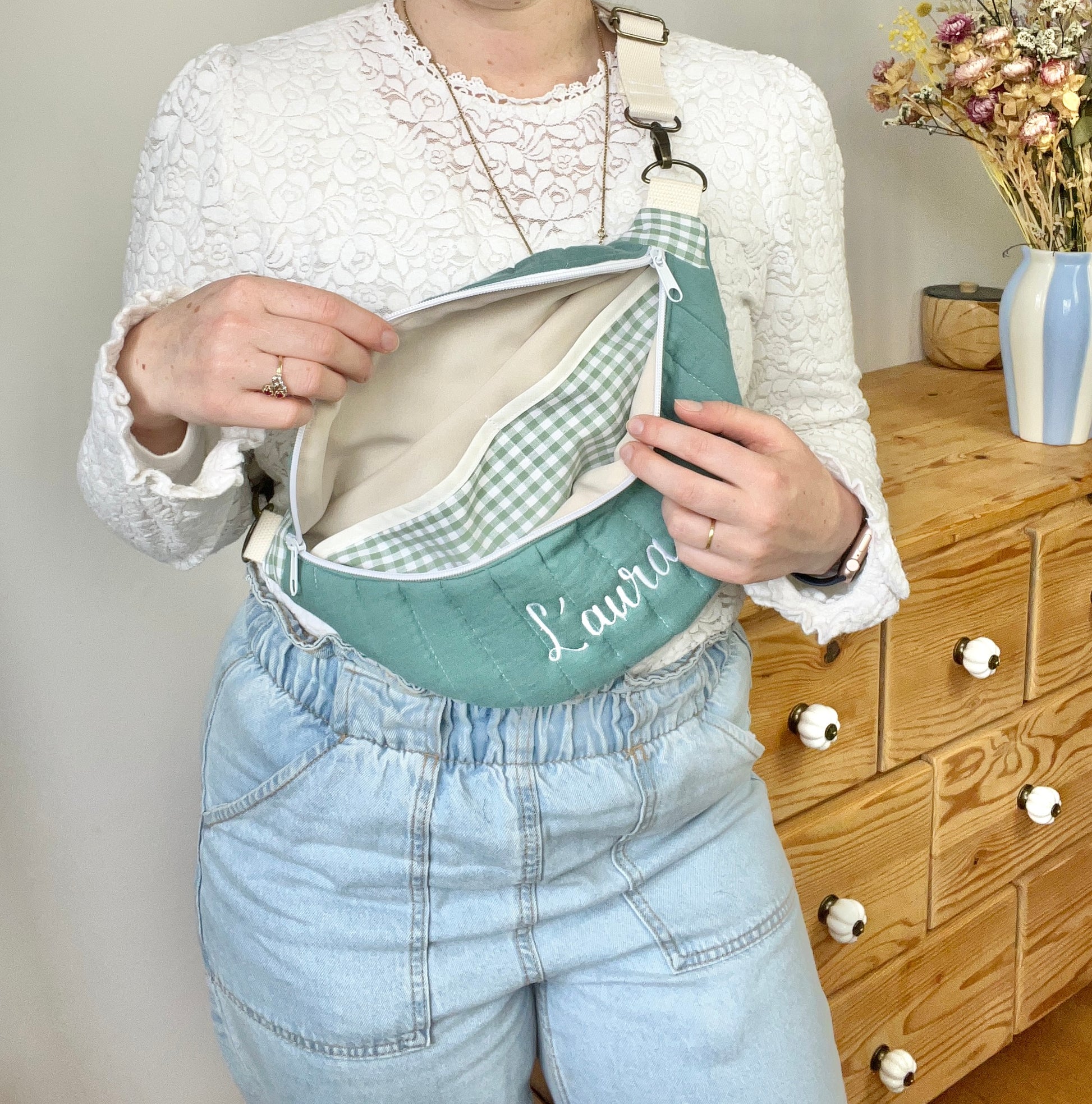 Ce joli sac banane vous accompagnera dans toutes vos sorties. Avec son anse interchangeable, vous pouvez facilement l’adapter à votre tenue en changeant de banane. Pratique et élégante, elle offre une grande contenance et des poches intérieures pour organiser vos affaires. Personnalisable à souhait, vous pouvez choisir les tissus et ajouter une broderie pour le personnaliser encore plus !