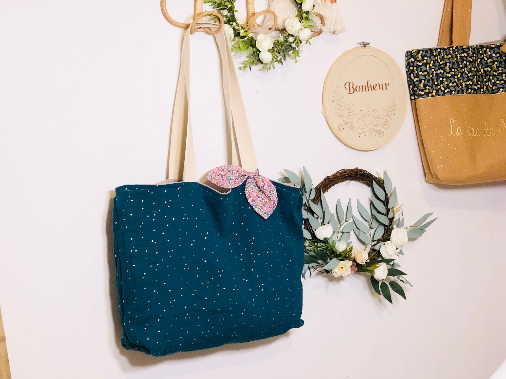Le petit Tote Bag  séduit par son design unique : ses anses en coton, son joli noeud et son intérieur aussi beau que fonctionnel.