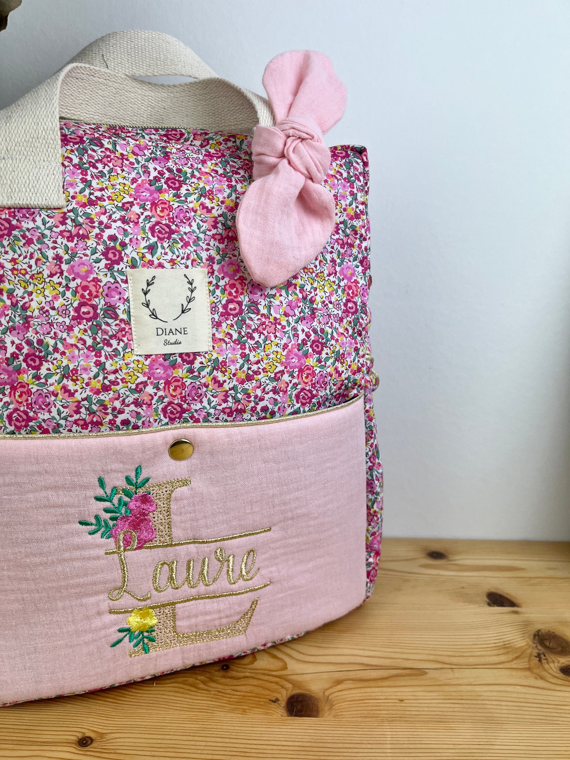 Le sac à dos enfant Ombeline Liberty Emma et gaze rose Personnalisable