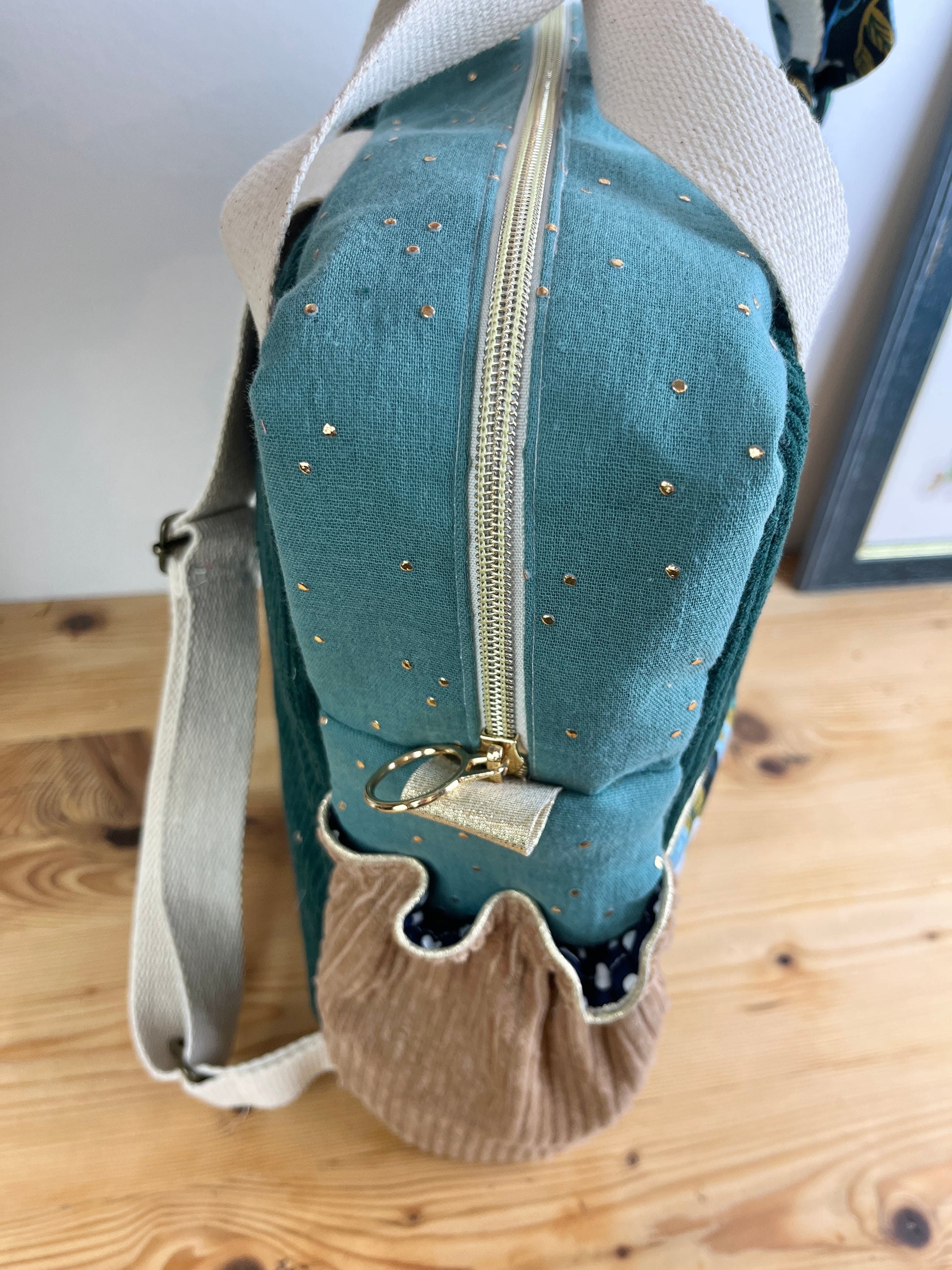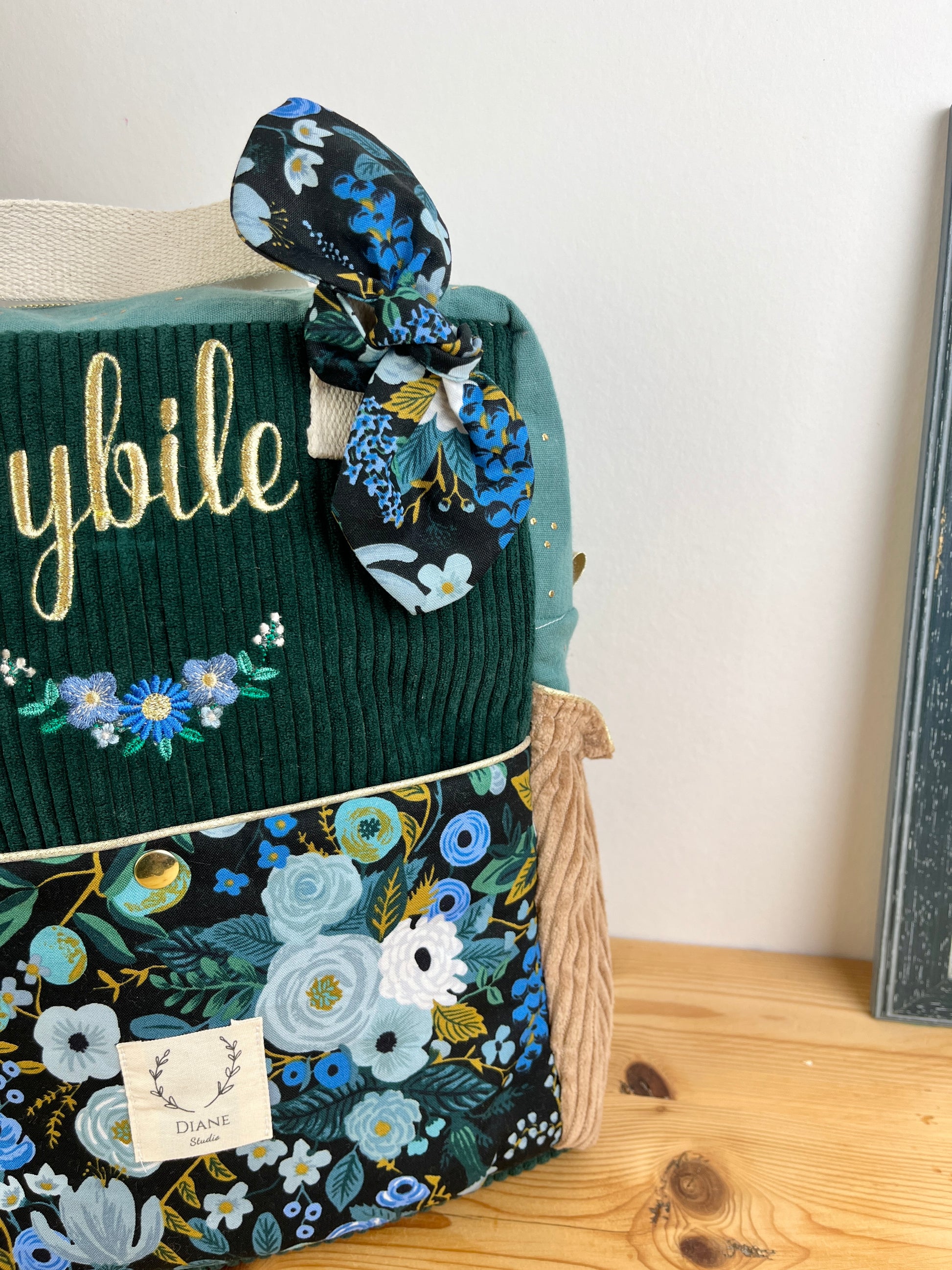 Le sac à dos enfant Ombeline velours vert garden party bleu Personnalisable