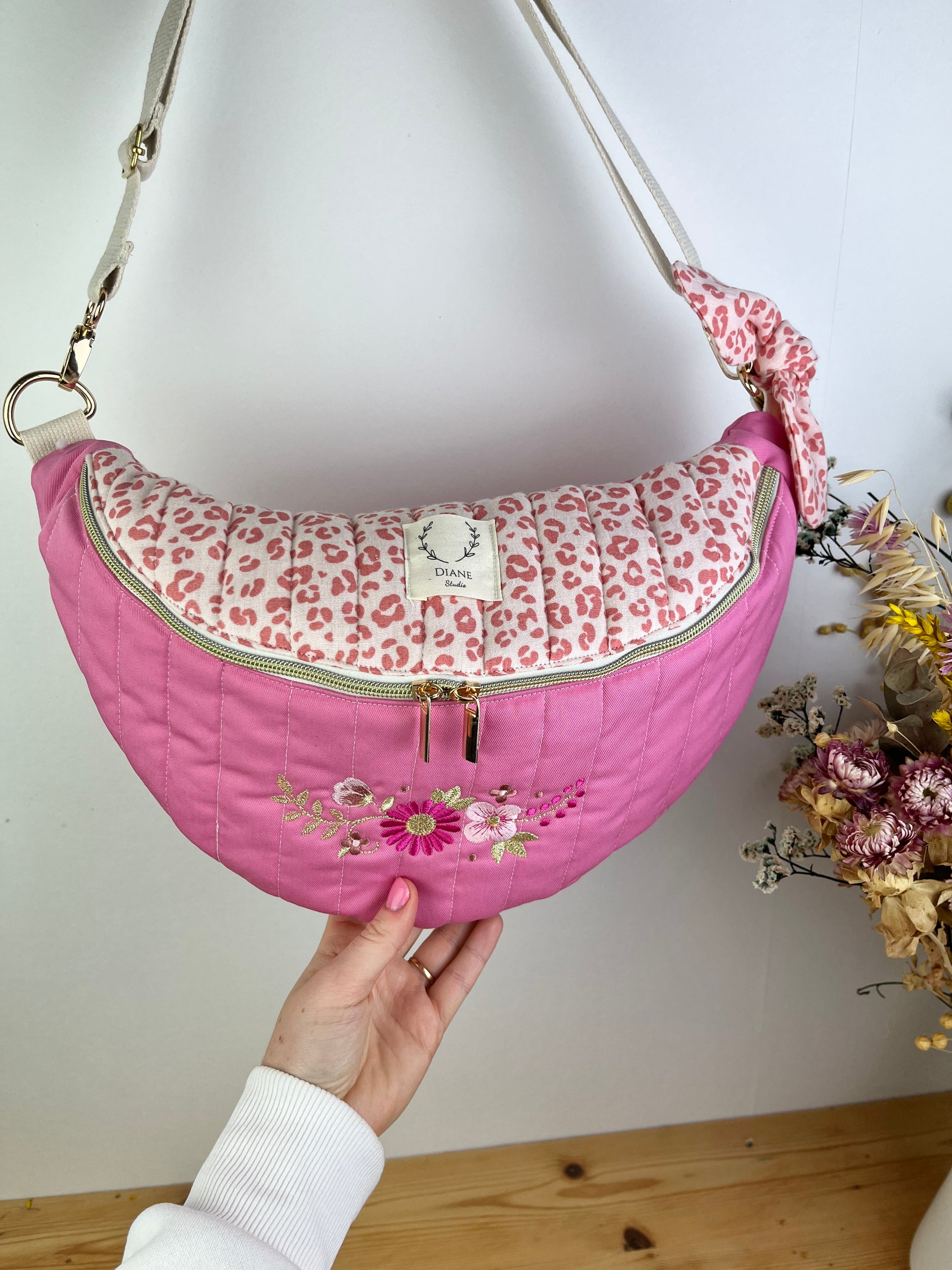 Le sac banane Eléonore gabardine rose et gaze léopard pink