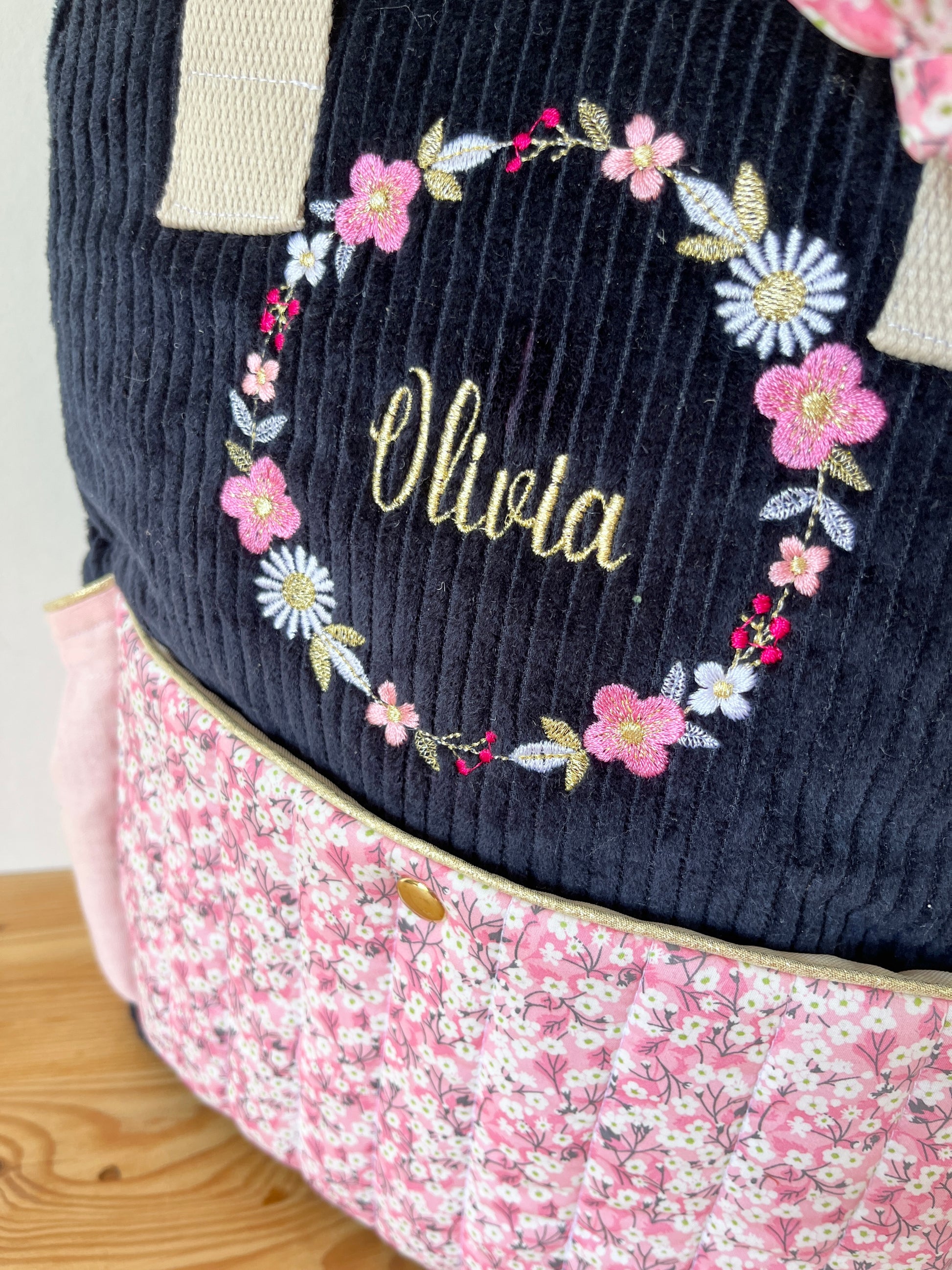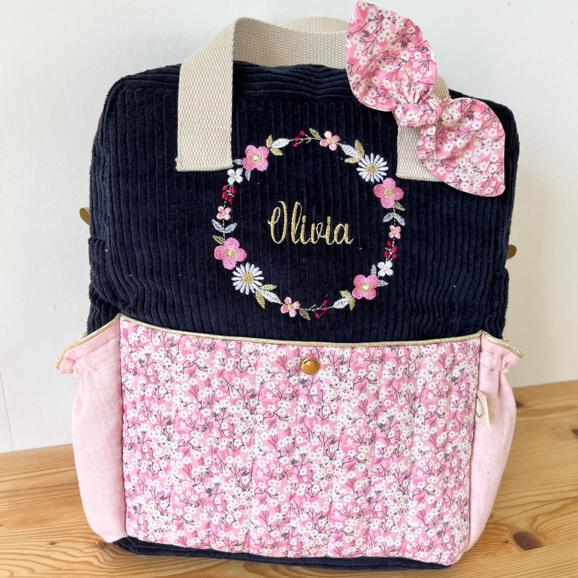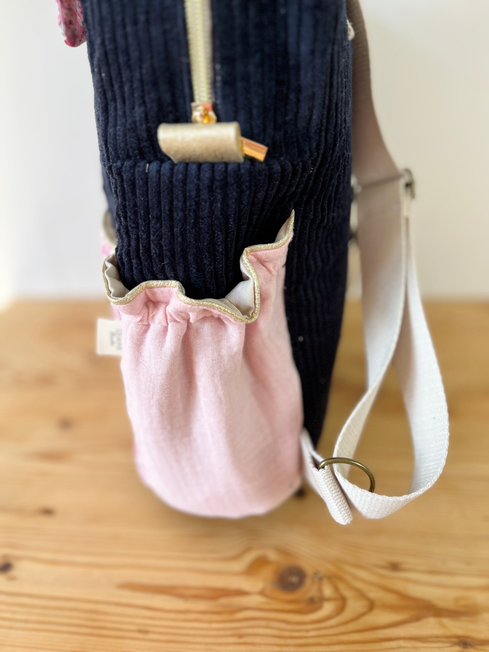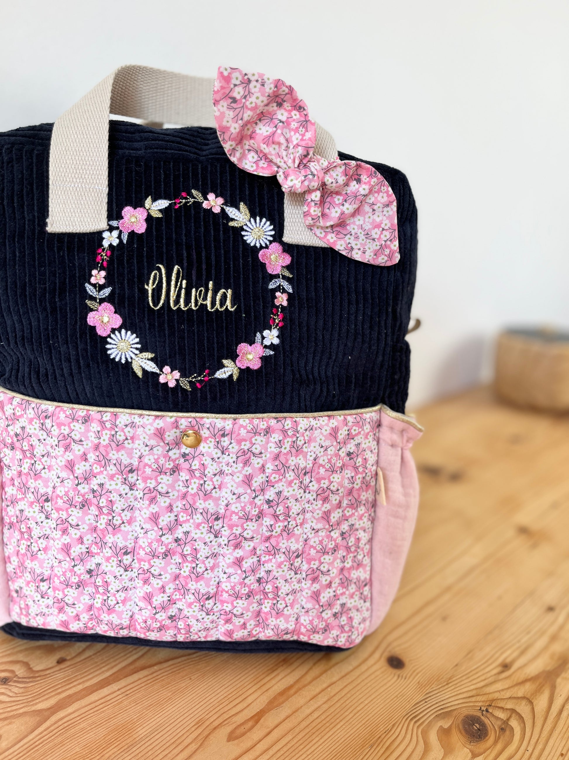 Le sac à dos enfant Ombeline personnalisé mitsi rose et velours bleu marine Personnalisable