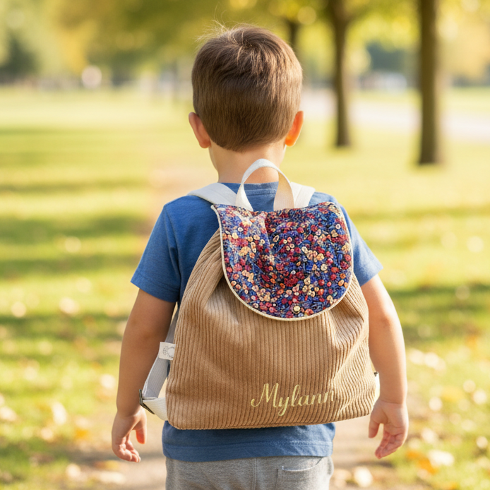 Le sac à dos Églantine velours camel et Liberty wiltshire burnt Personnalisable